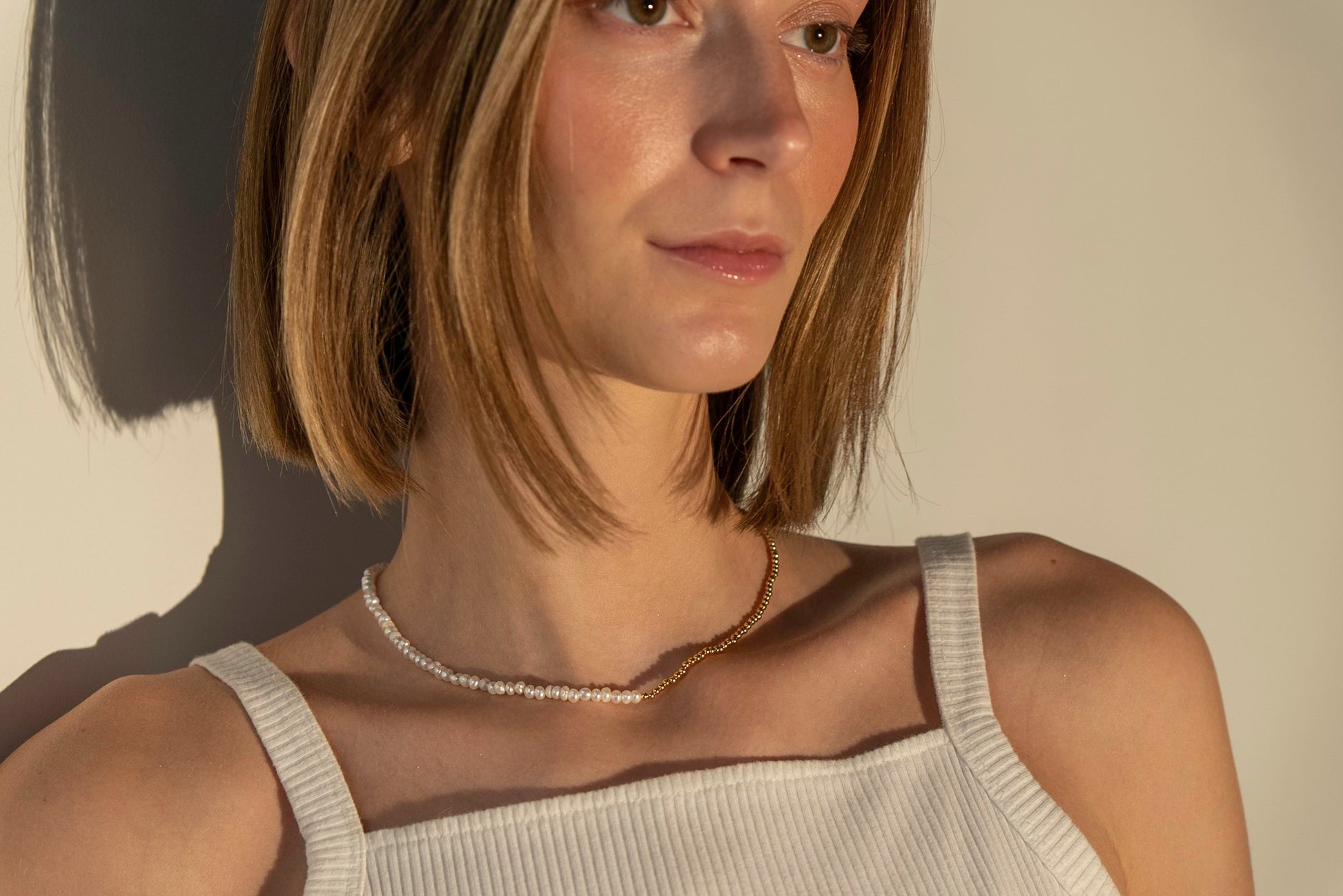 The Alana Pearl Necklace brings together the natural glow of genuine freshwater pearls with gold vermeil or sterling silver details. Designed to contour the neckline with intention and grace.
