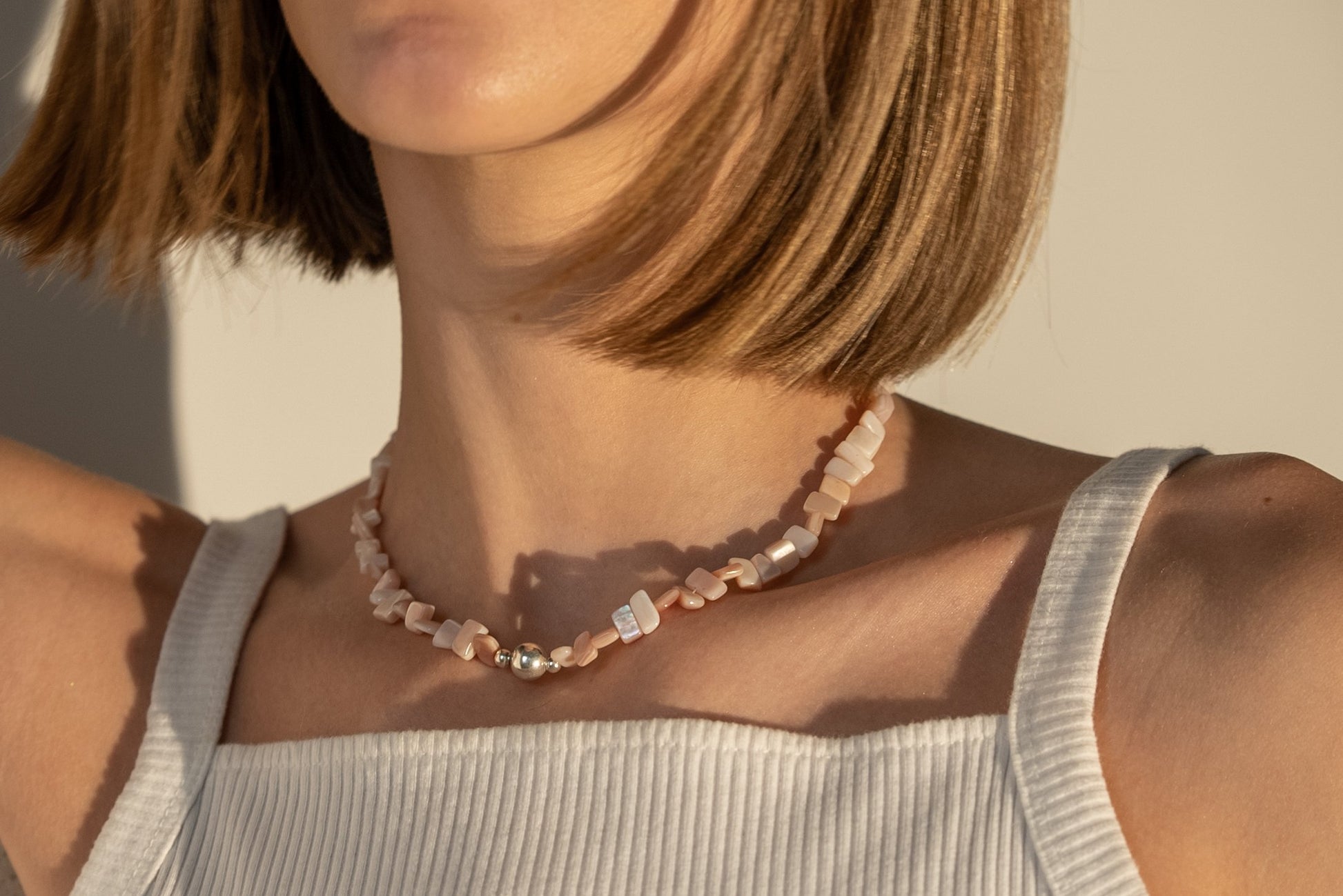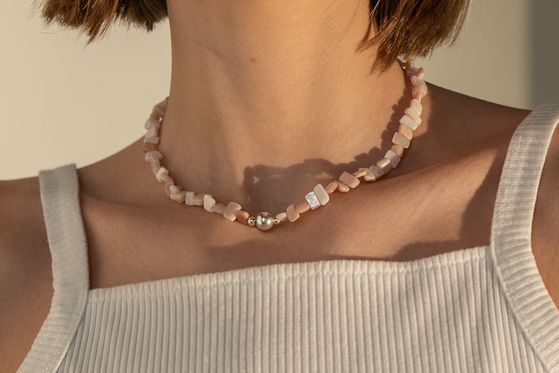 Athena Necklace combines iridescent mother of pearl with sleek silver beads, finished with our signature handmade closures. Its natural shimmer makes it a versatile piece ~ refined enough to wear alone, yet striking when layered with other chains.