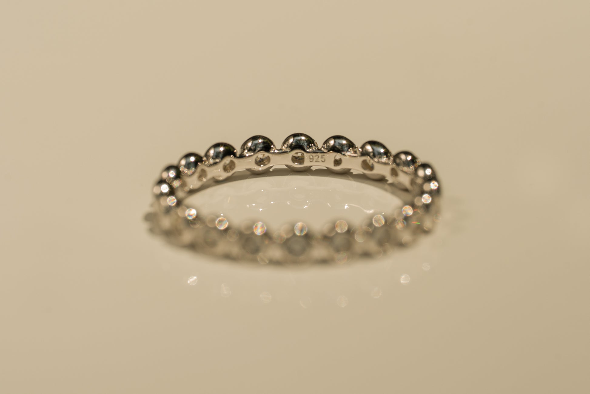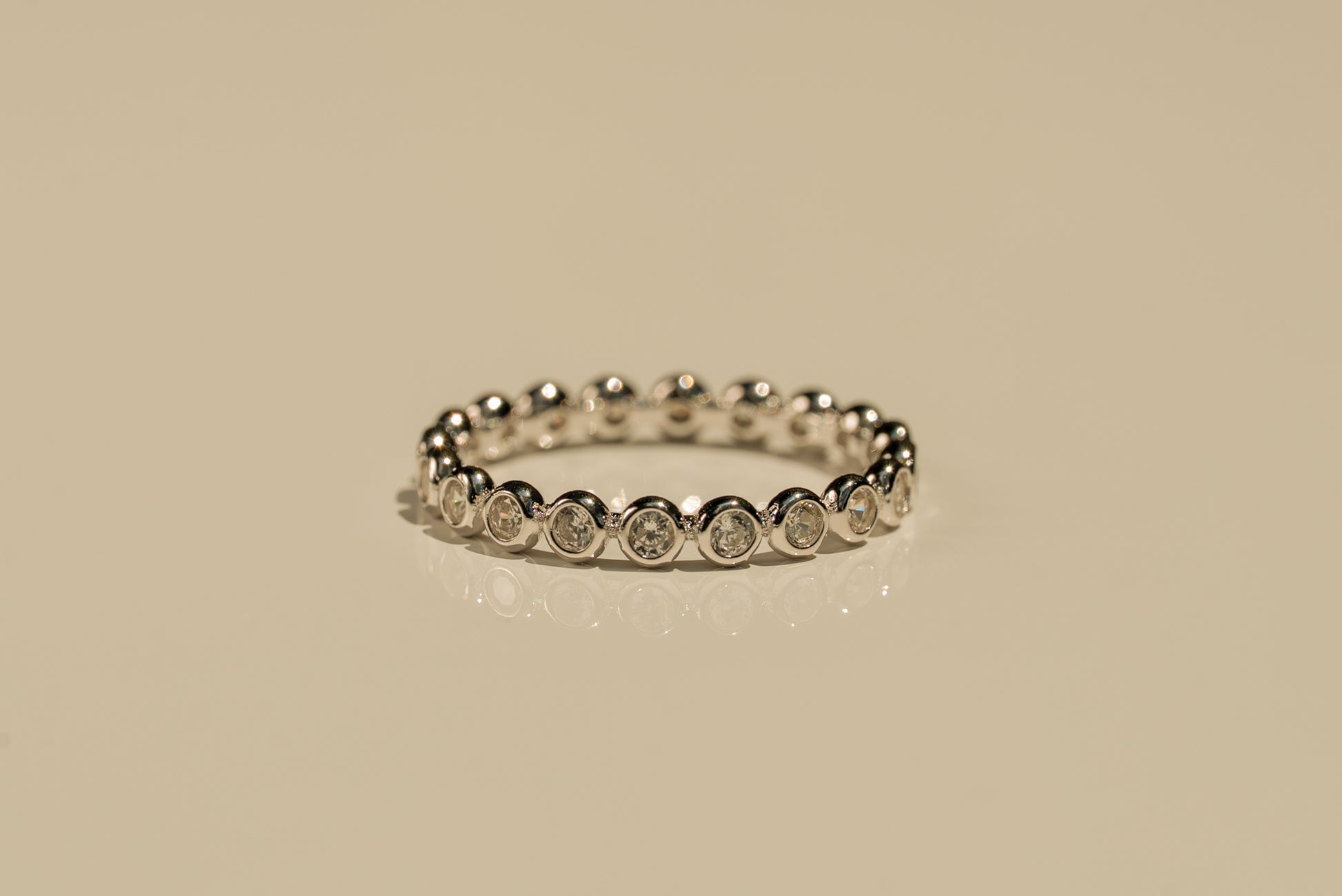 Bubble Frames Ring encircles the finger with bezel-set gems that sparkle from every angle. Its smooth silver bubbles give the piece a modern, sculptural silhouette while keeping it lightweight and comfortable for everyday wear. Perfect as a stacking ring or a delicate solo statement.