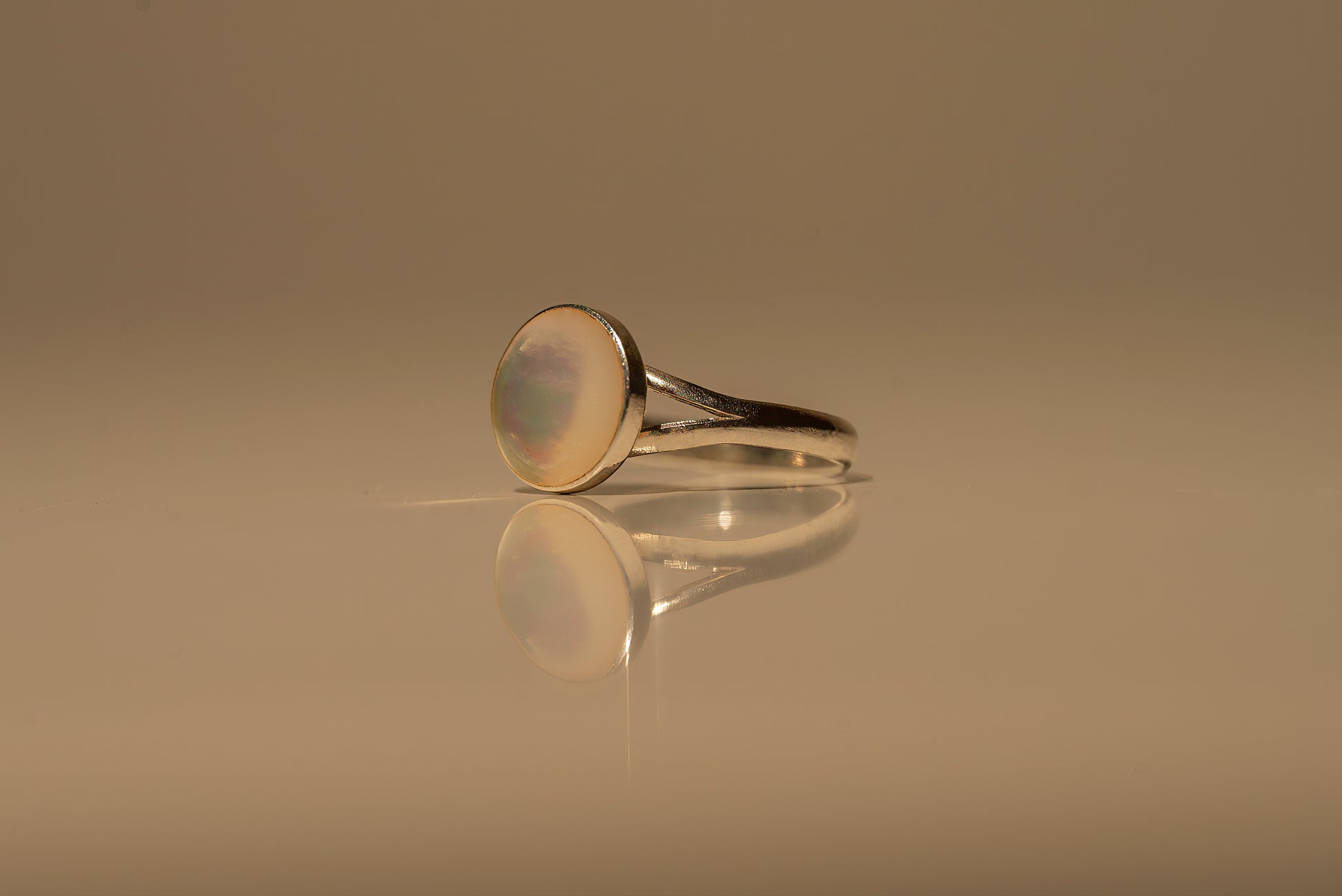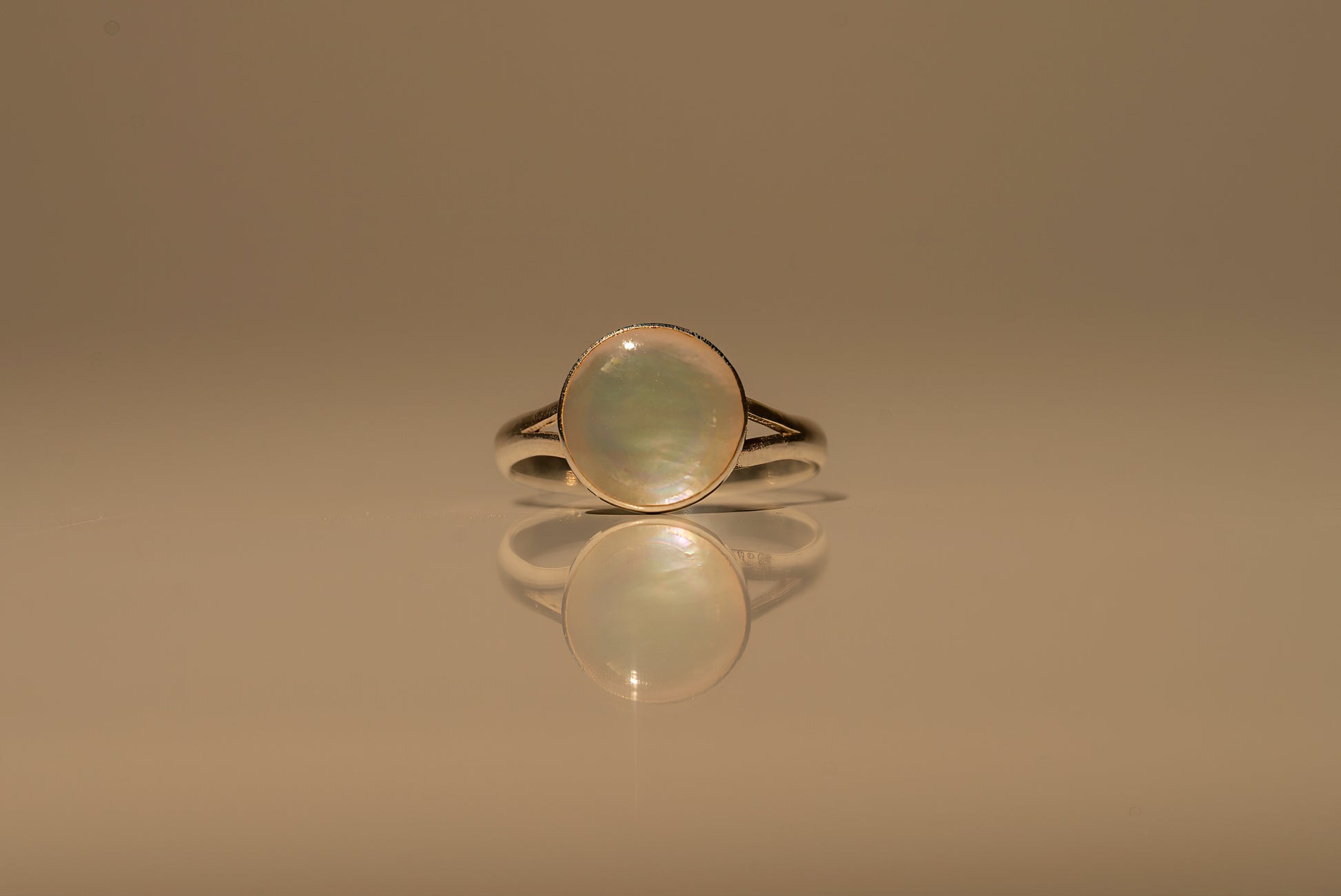 This ring captures the ethereal glow of moonlight with a magnificent, hand-selected Mother of Pearl cabochon. The stone’s natural iridescence is framed by a sculptural Sterling Silver setting, featuring an architectural split-shank design that lifts the gem to catch the light from every angle. It is a piece of quiet majesty, minimalist in geometry yet maximalist in its luminous presence.