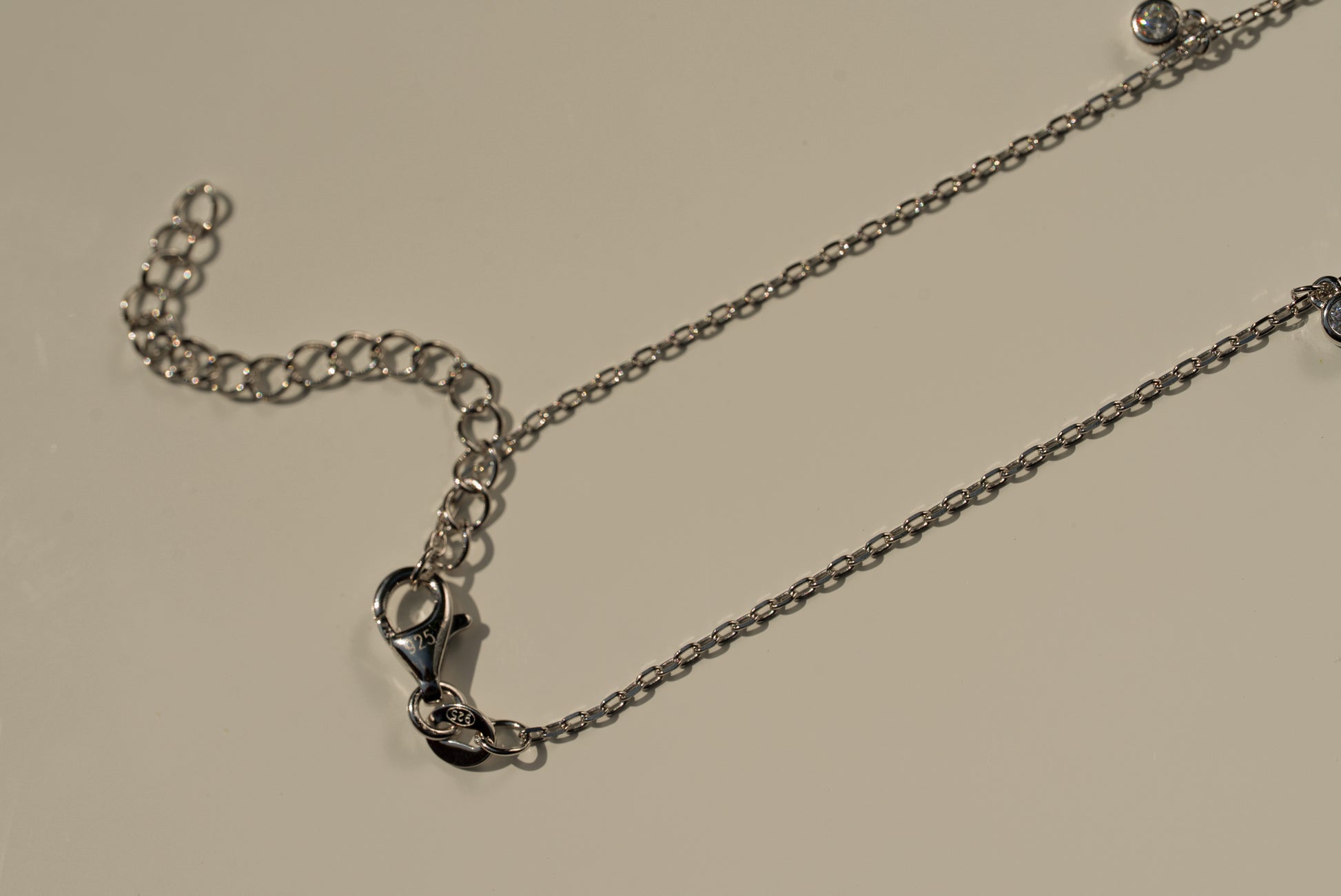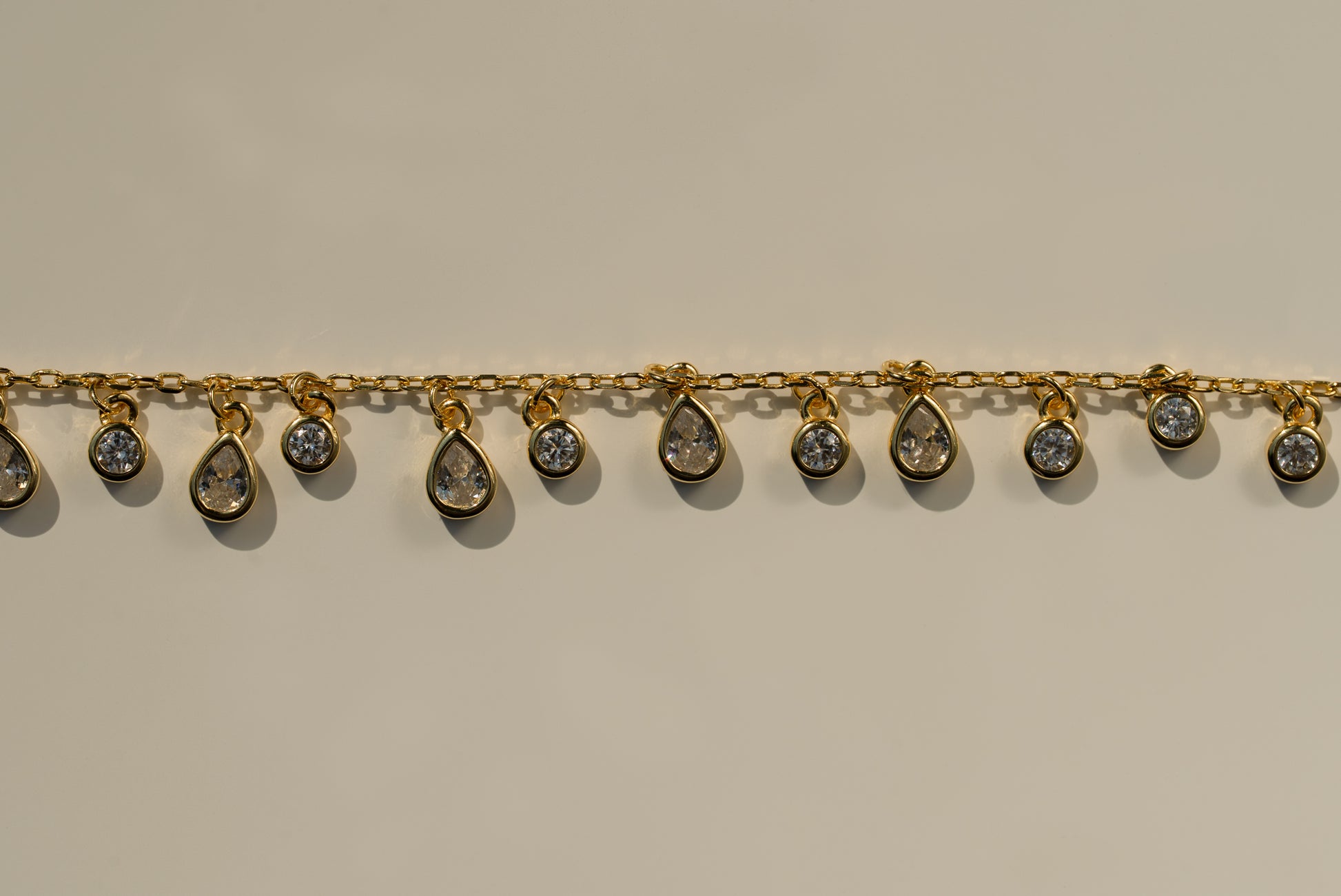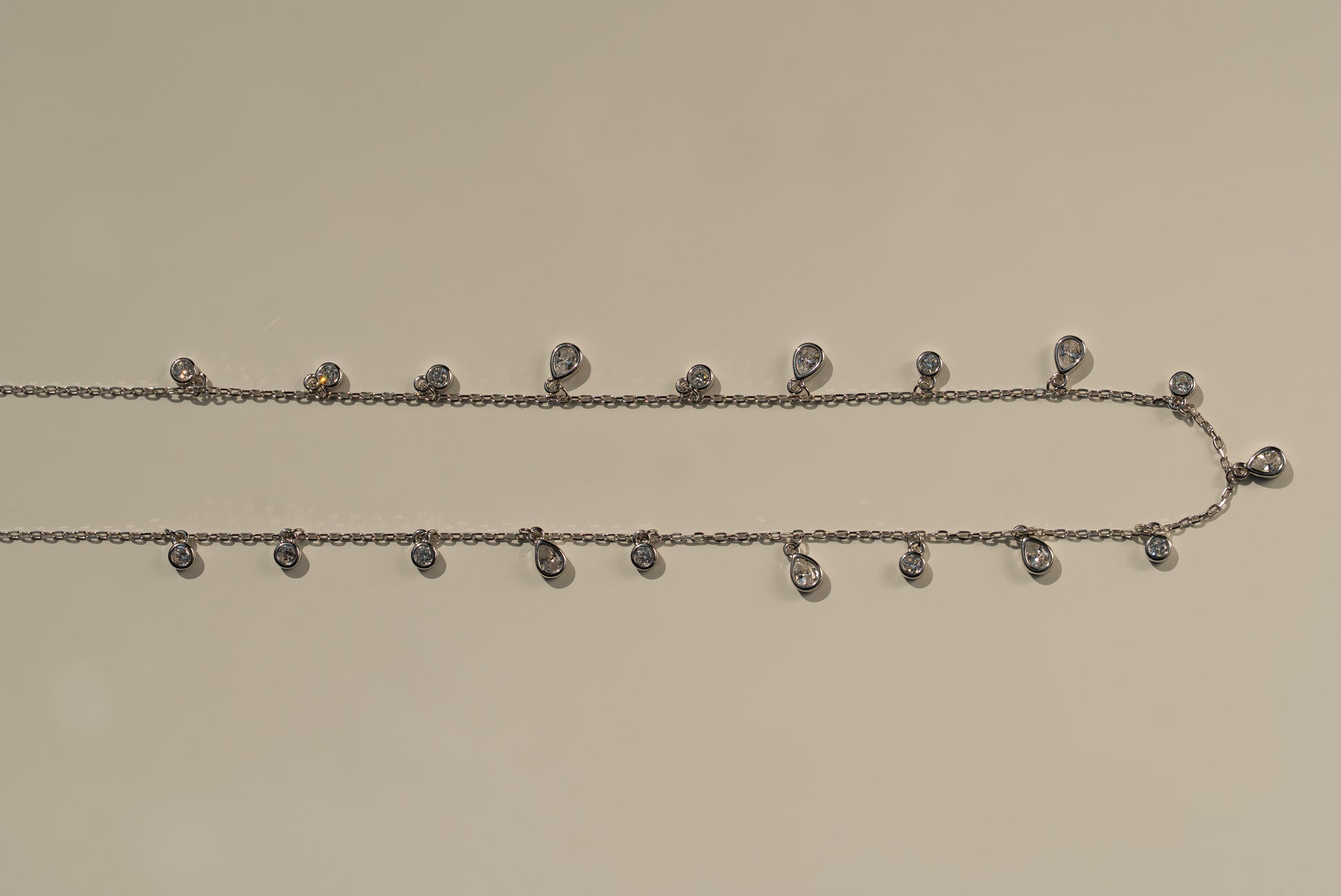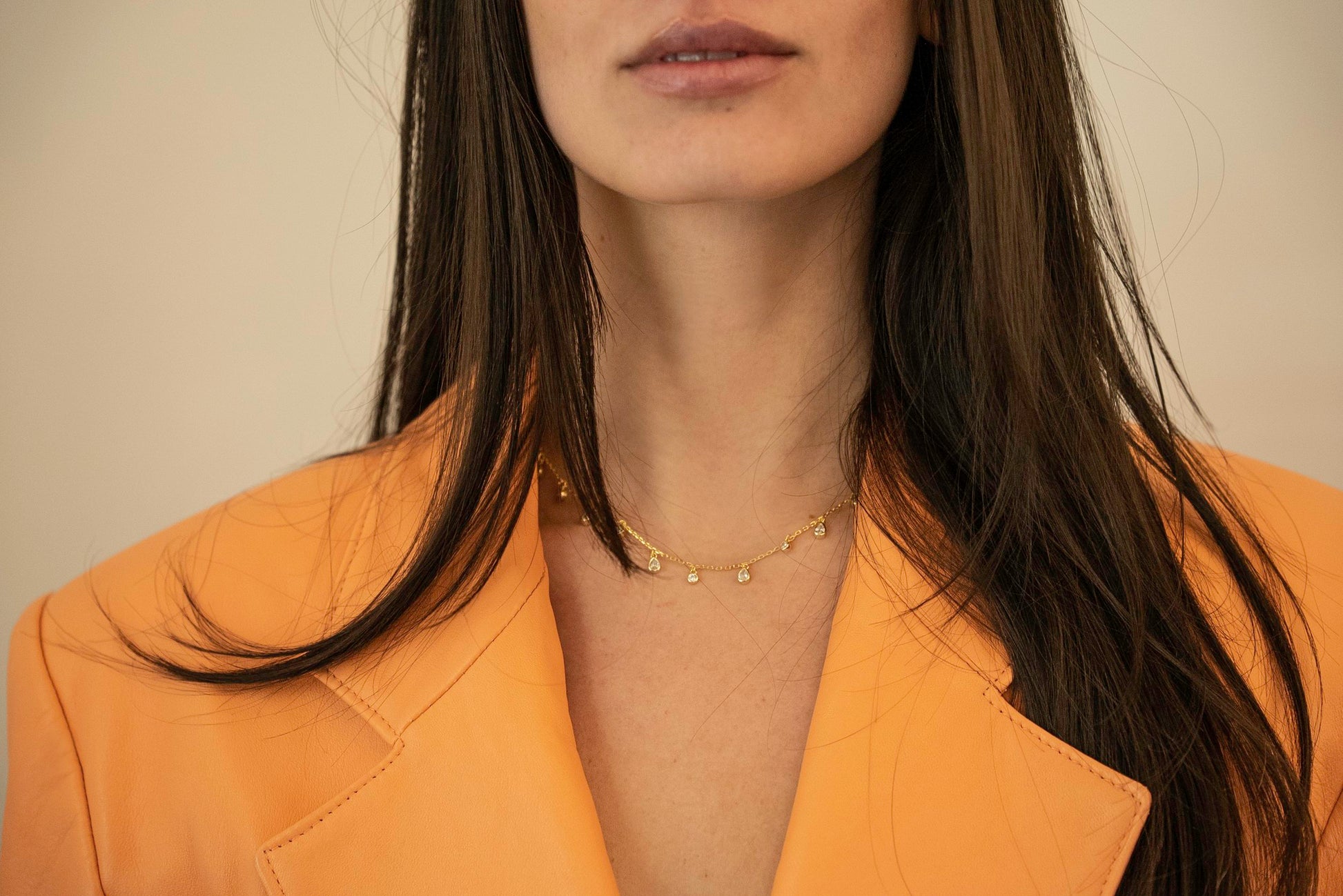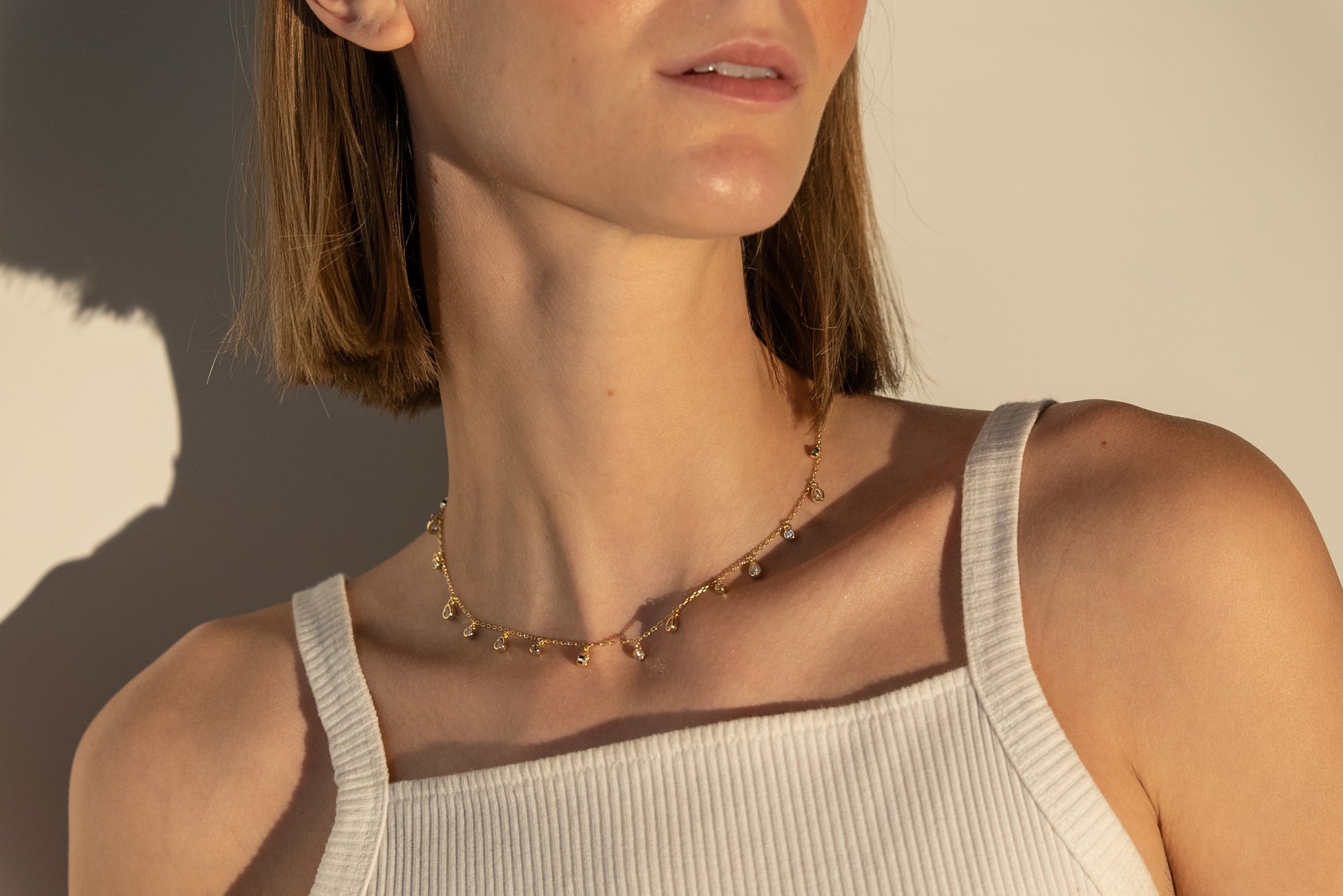 Drippy Gem Necklace features a cascade of bezel-set CZ gems that dance with light at every angle. Adjustable for the perfect fit, it’s a statement piece that adds instant sparkle whether styled alone or layered.