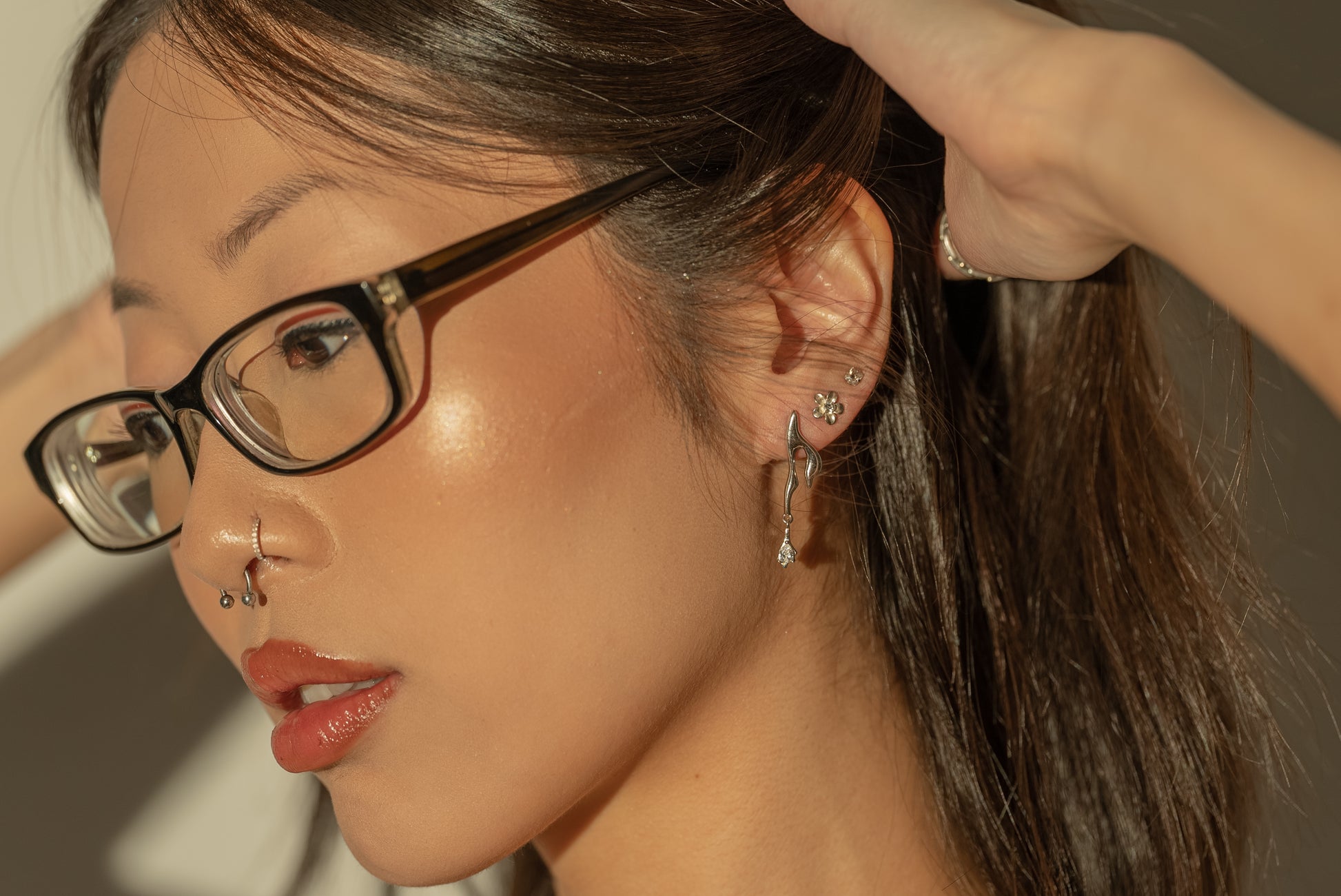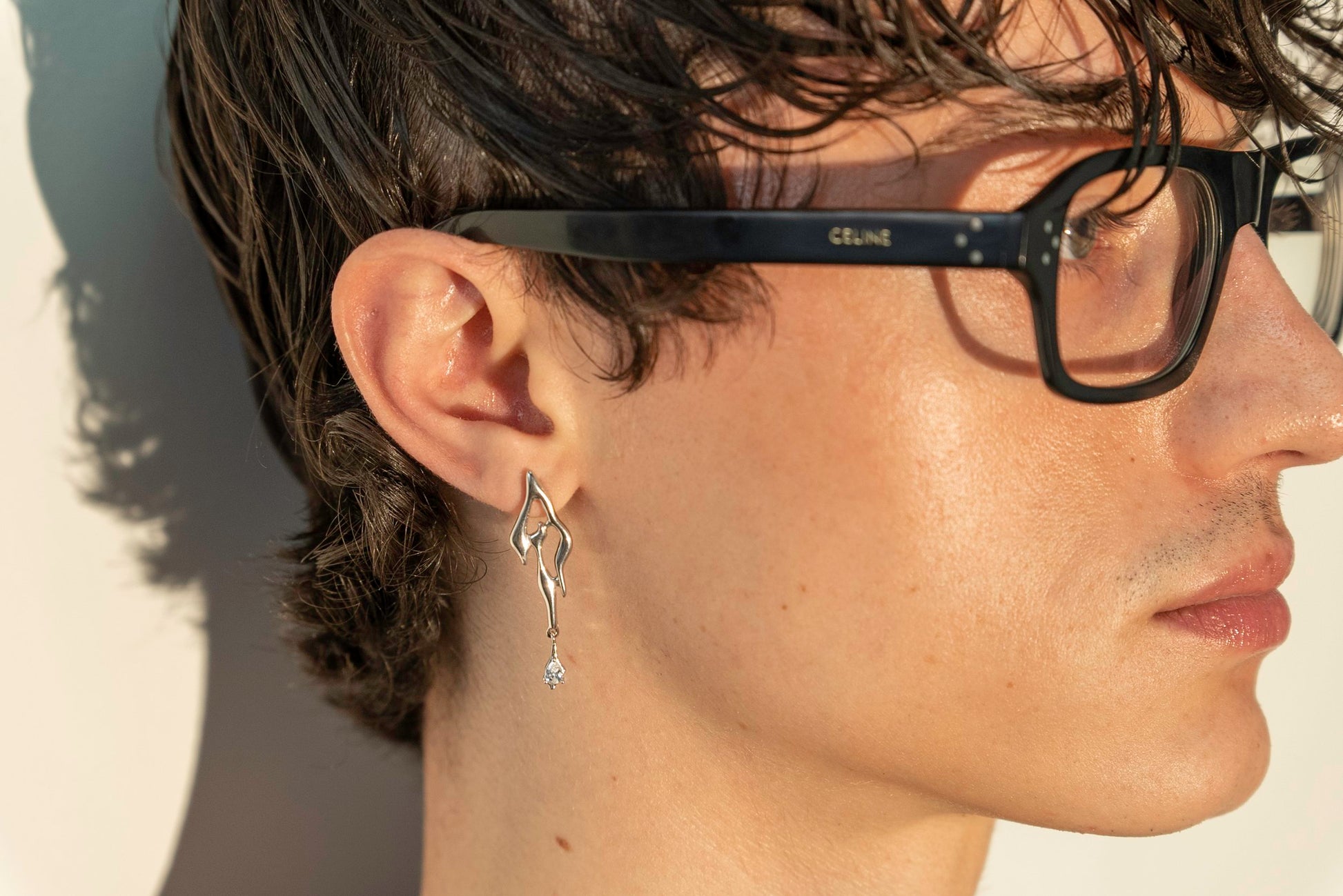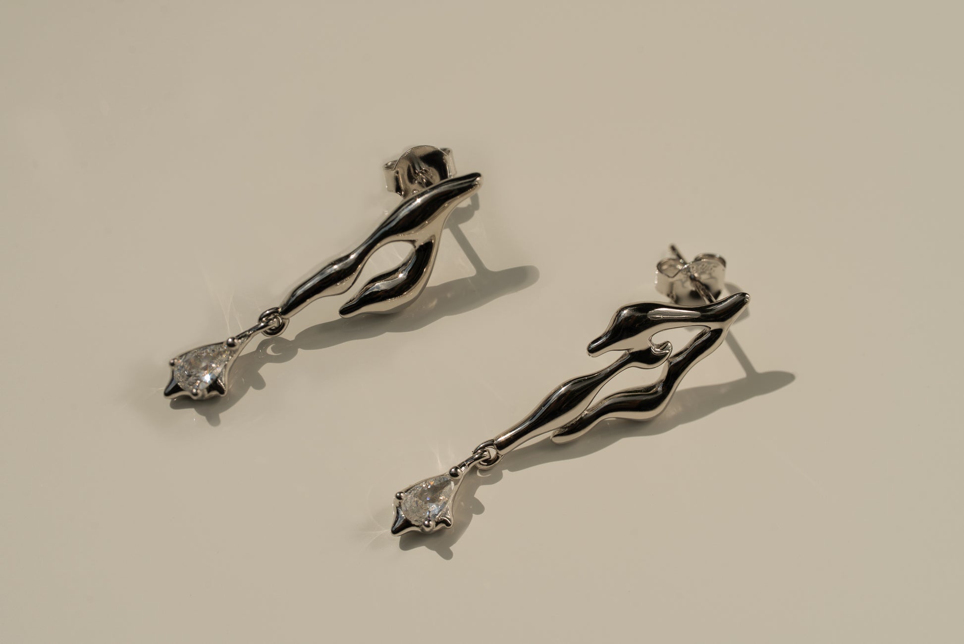 Ember Earrings feature molten silver curves with dangling high-quality cubic zirconia drops. Offered in mismatched pairs and two sizes, they strike the perfect balance of edge and refinement.