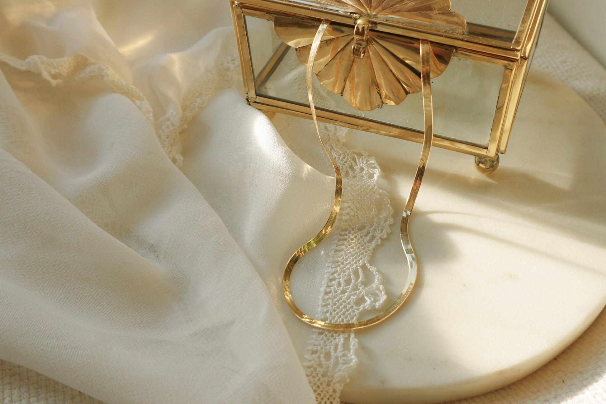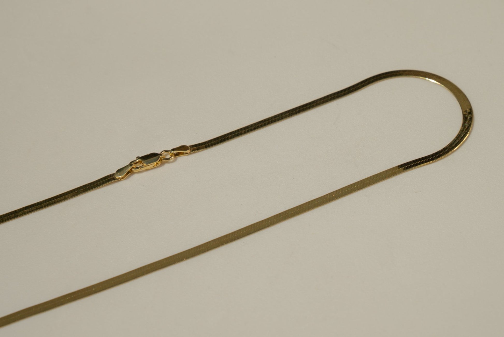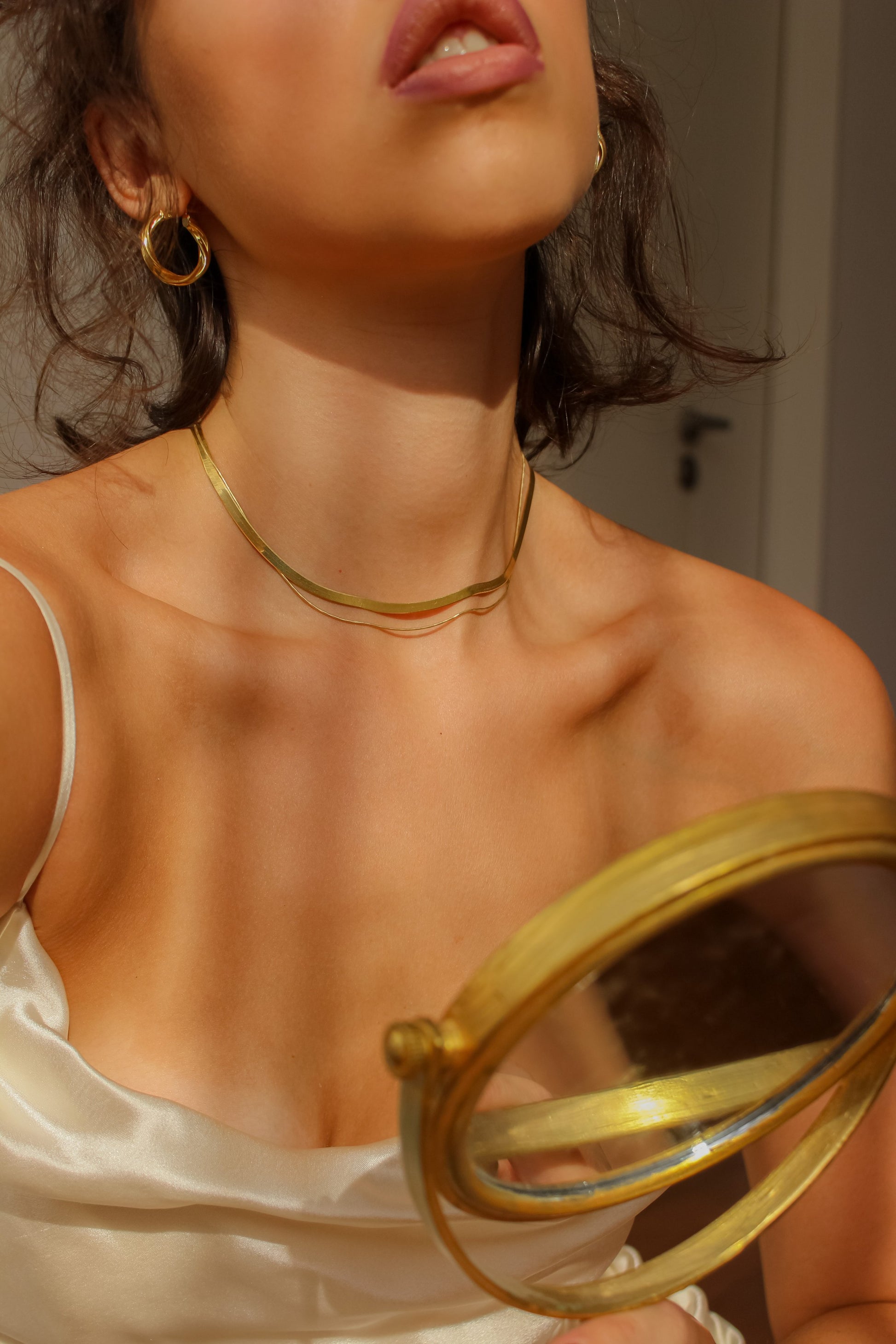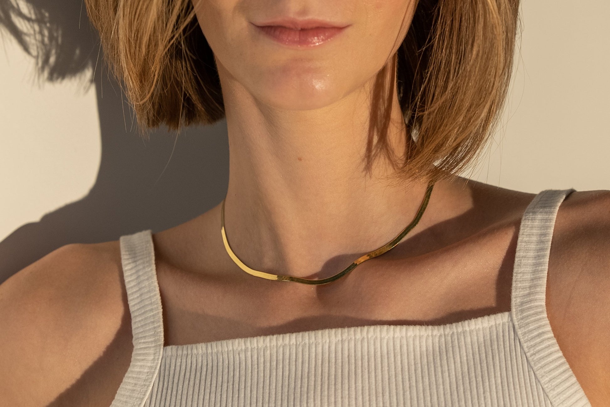 Flat Chain is a modern classic designed to lay smoothly against the neckline. Its reflective surface and fluid silhouette make it a bold yet versatile piece, perfect worn solo or layered for striking contrast.