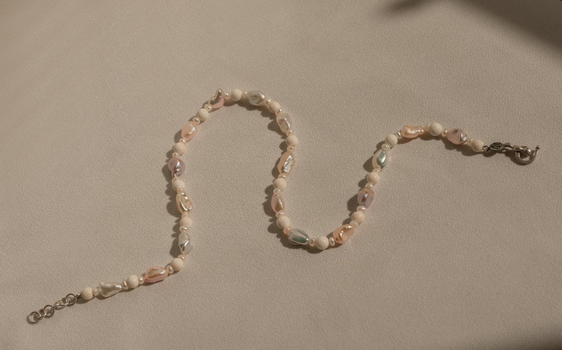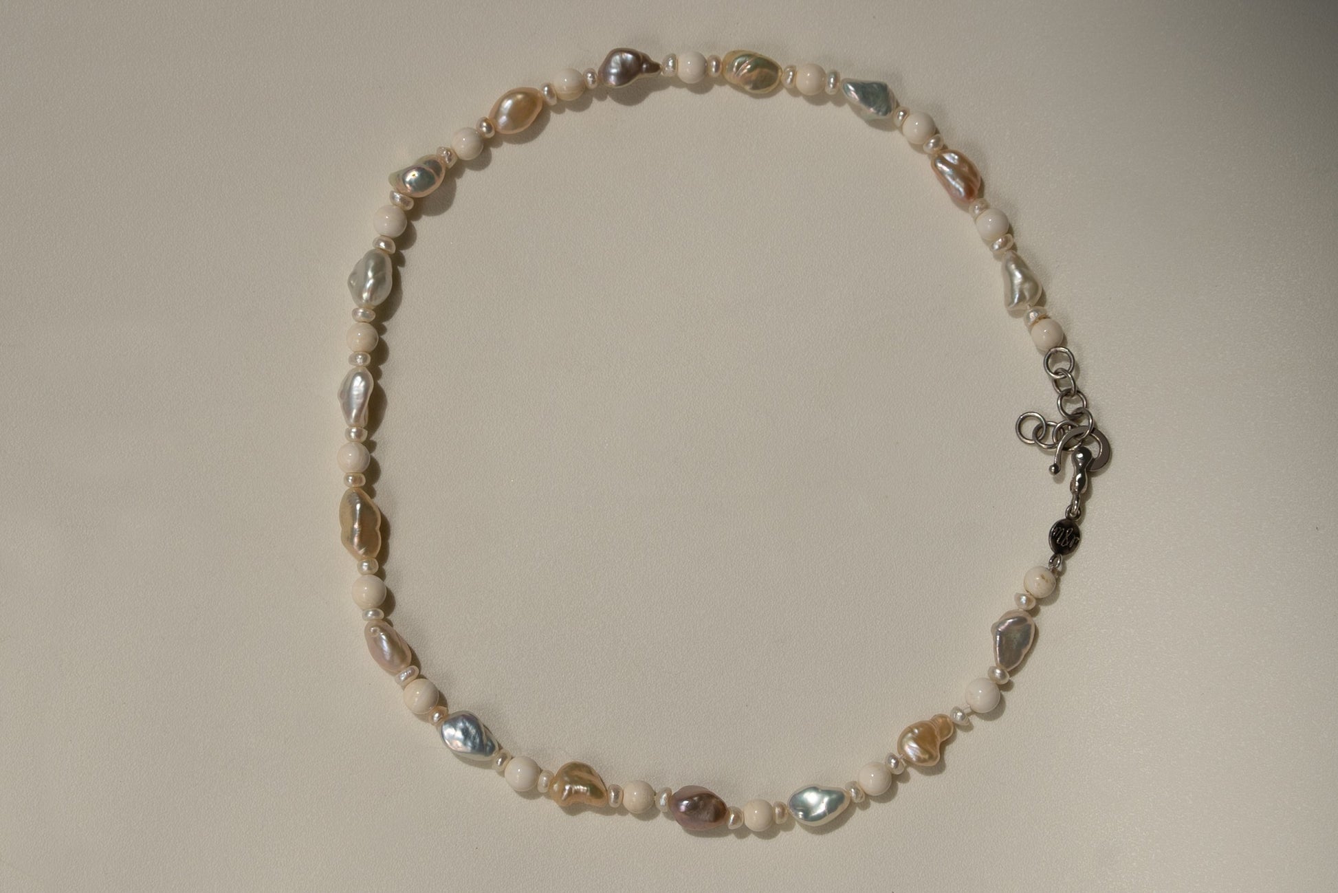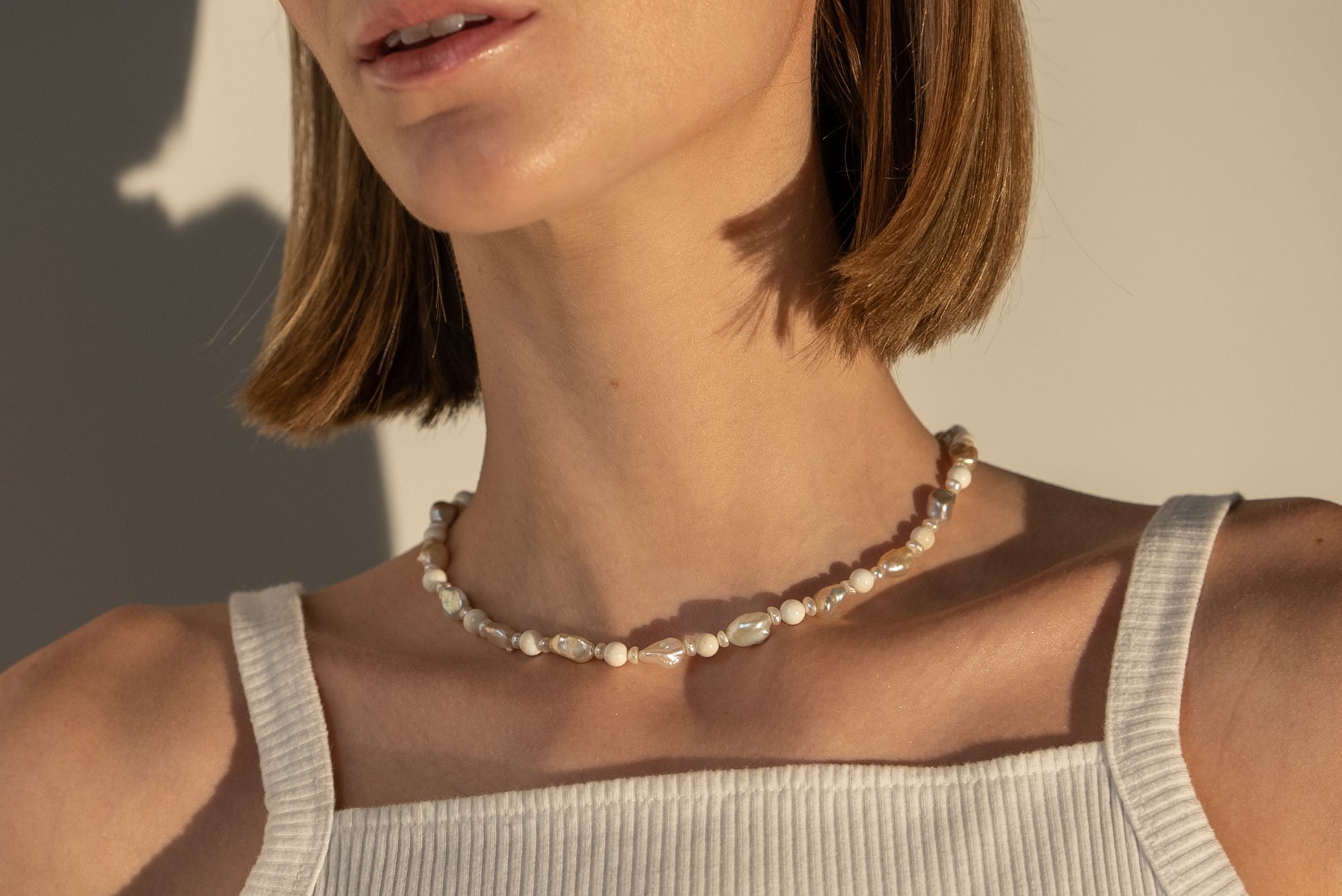 Sea Glass Pearl Necklace blends genuine pearls with shell beads in organic, natural shapes. Each bead catches the light with a soft shimmer, creating an ocean-kissed elegance. Finished with our signature handmade closures for an artisanal touch.