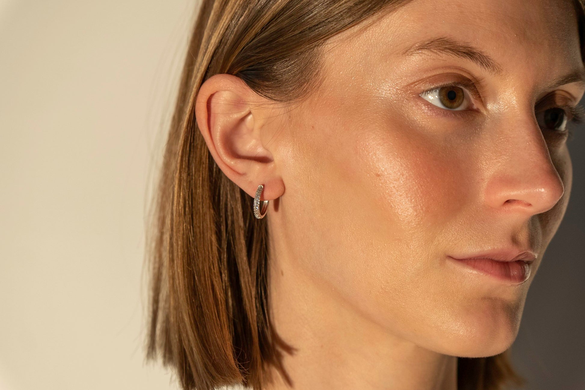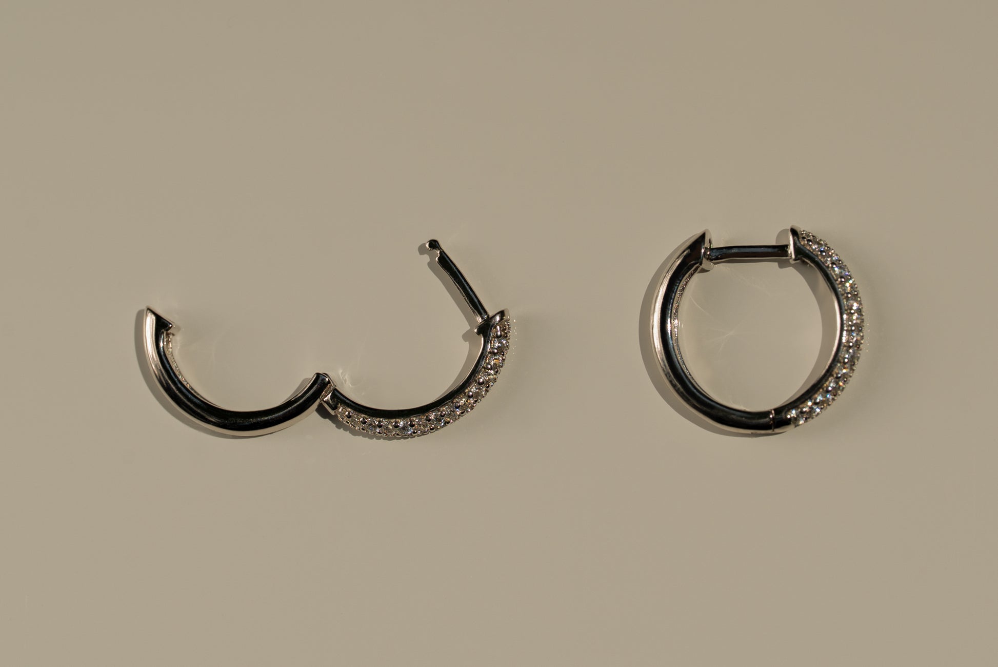 Glam Hoops feature a smooth silver body accented with pavé-set CZ gems for a refined shine that catches the light at every angle. Their soft, fluid edges and hinged closure make them as comfortable as they are versatile.