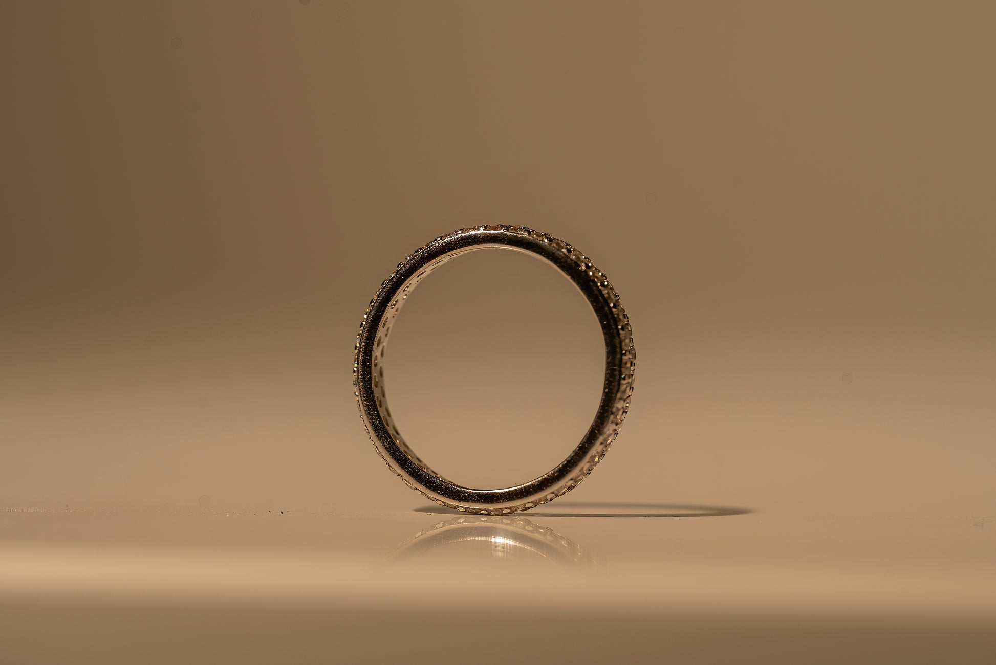 • Construction: Half-eternity design (stones on front, smooth metal on back)