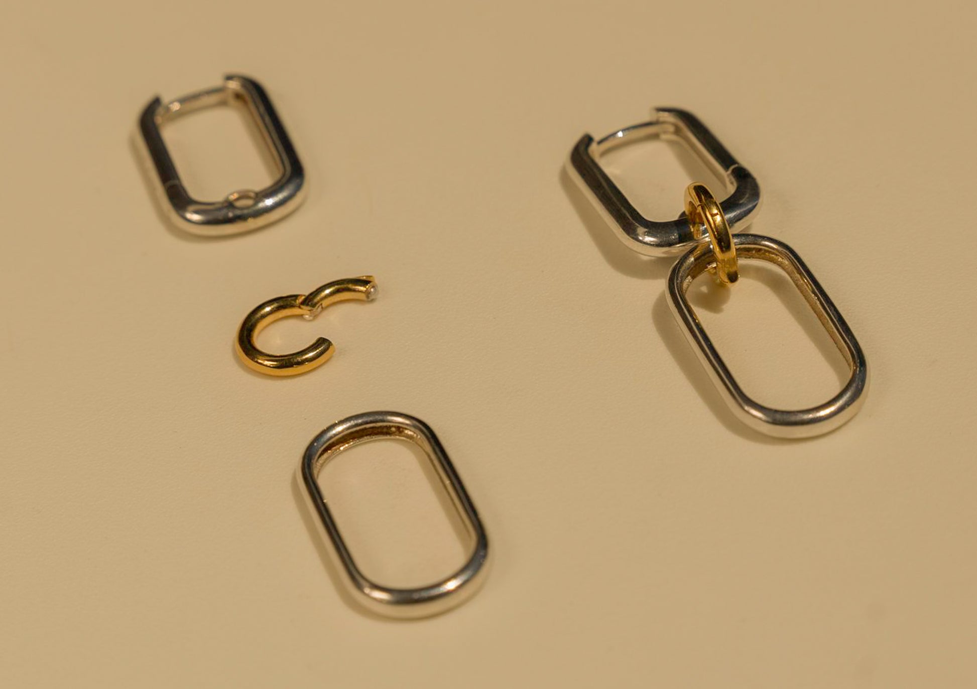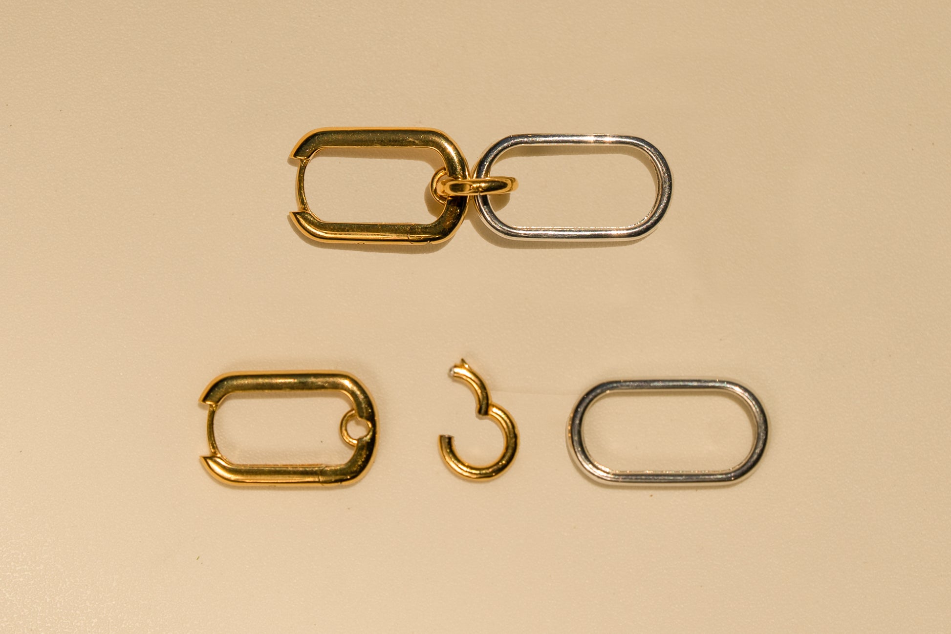 • Three-part modular design: huggie base, connector (circle or oval), and drop (Melting Heart or Paperclip)
