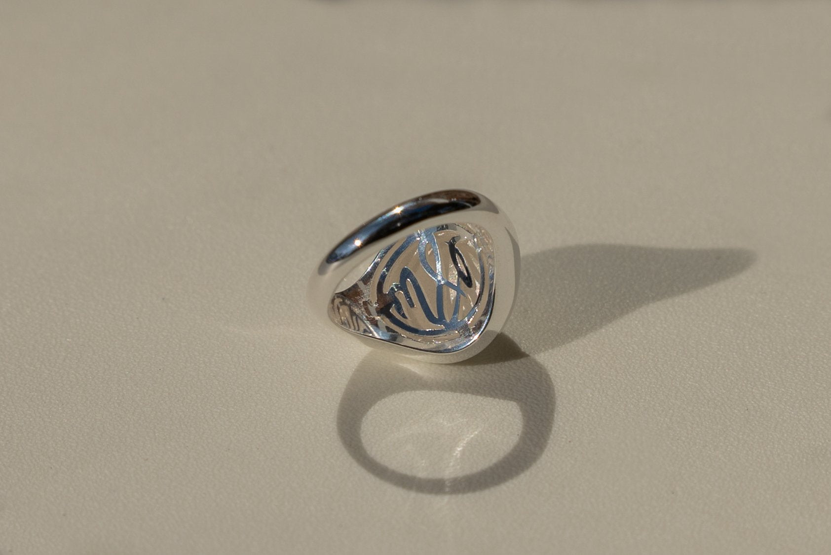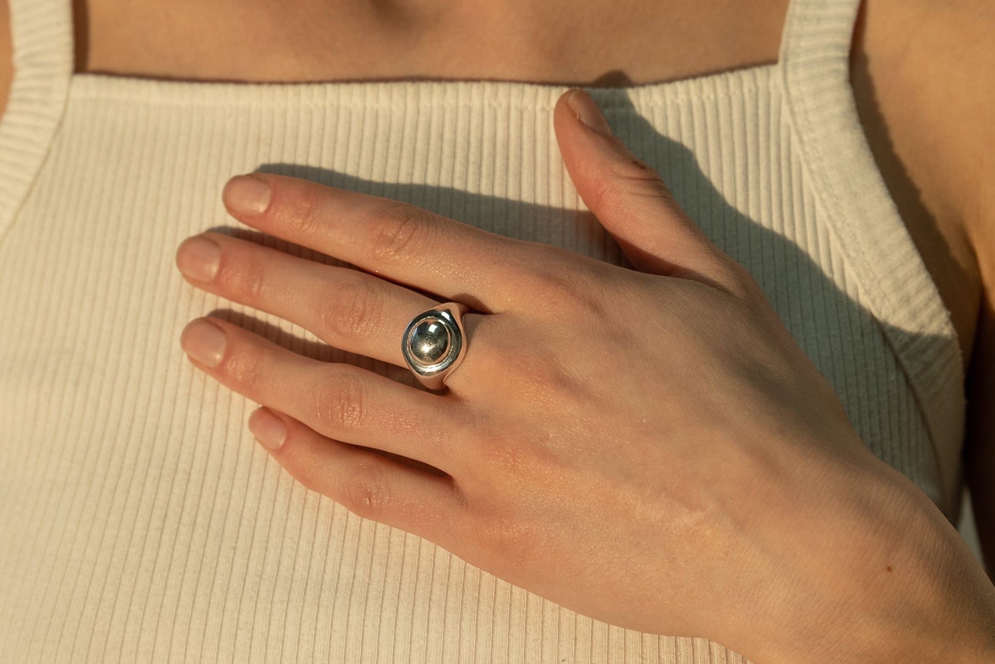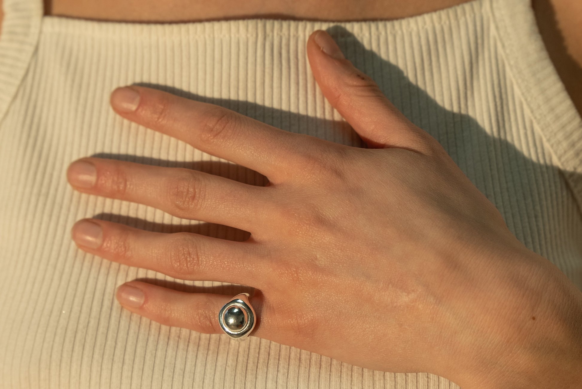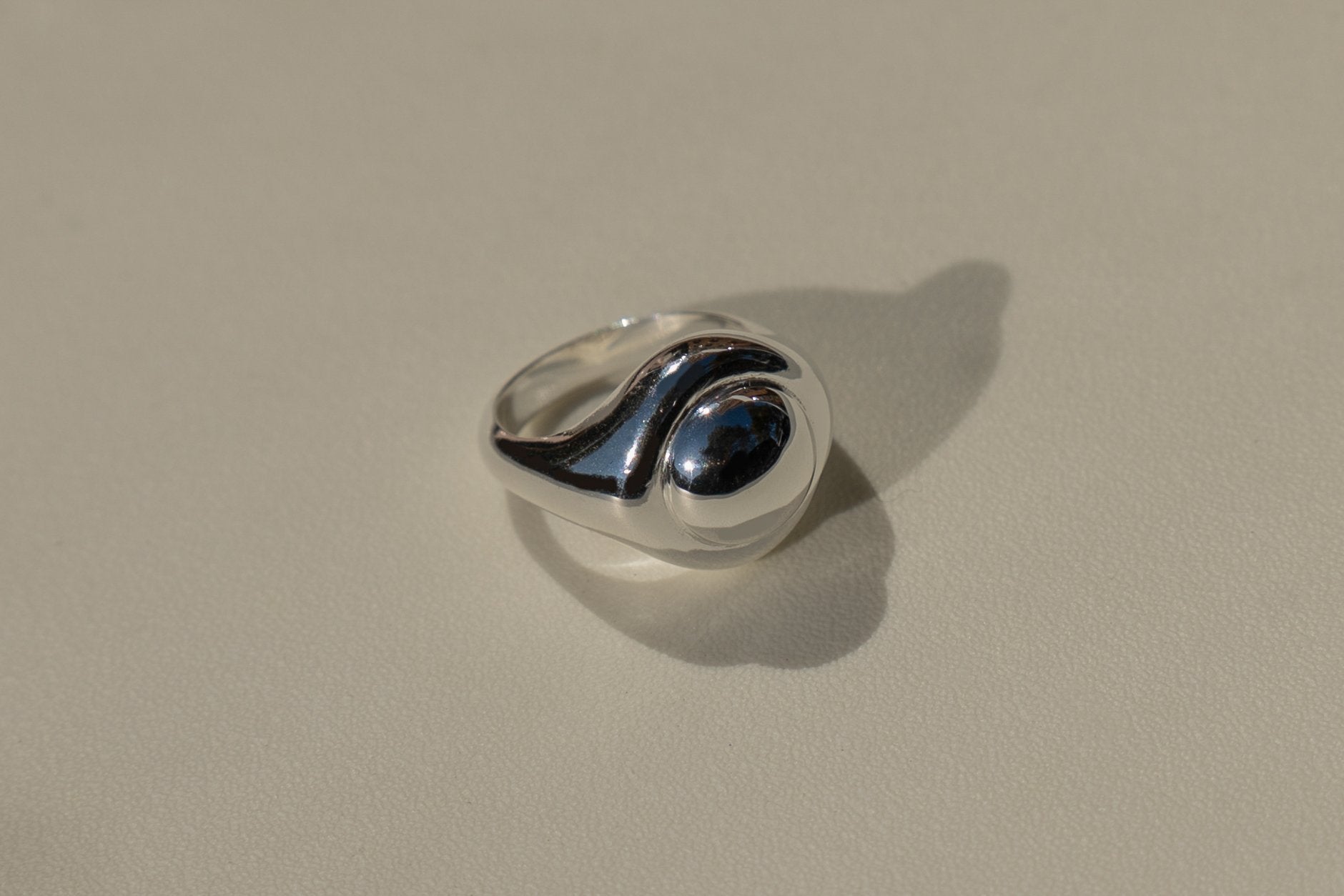 Iris Ring is a bold yet timeless piece that brings sculptural presence to the hand. Featuring smooth curves and a rounded center, it’s designed for comfort without losing its striking silhouette. Inside, a hidden Milk & Rose monogram is engraved as a subtle signature detail.