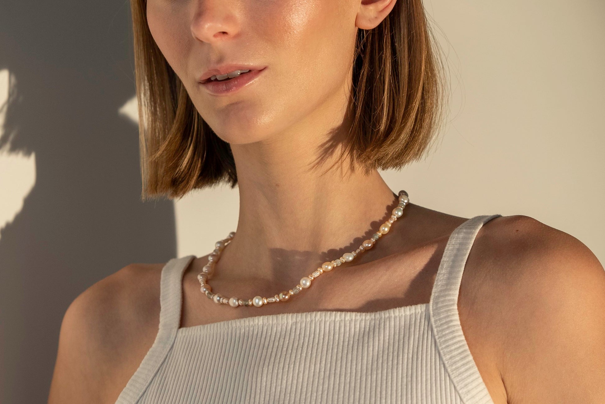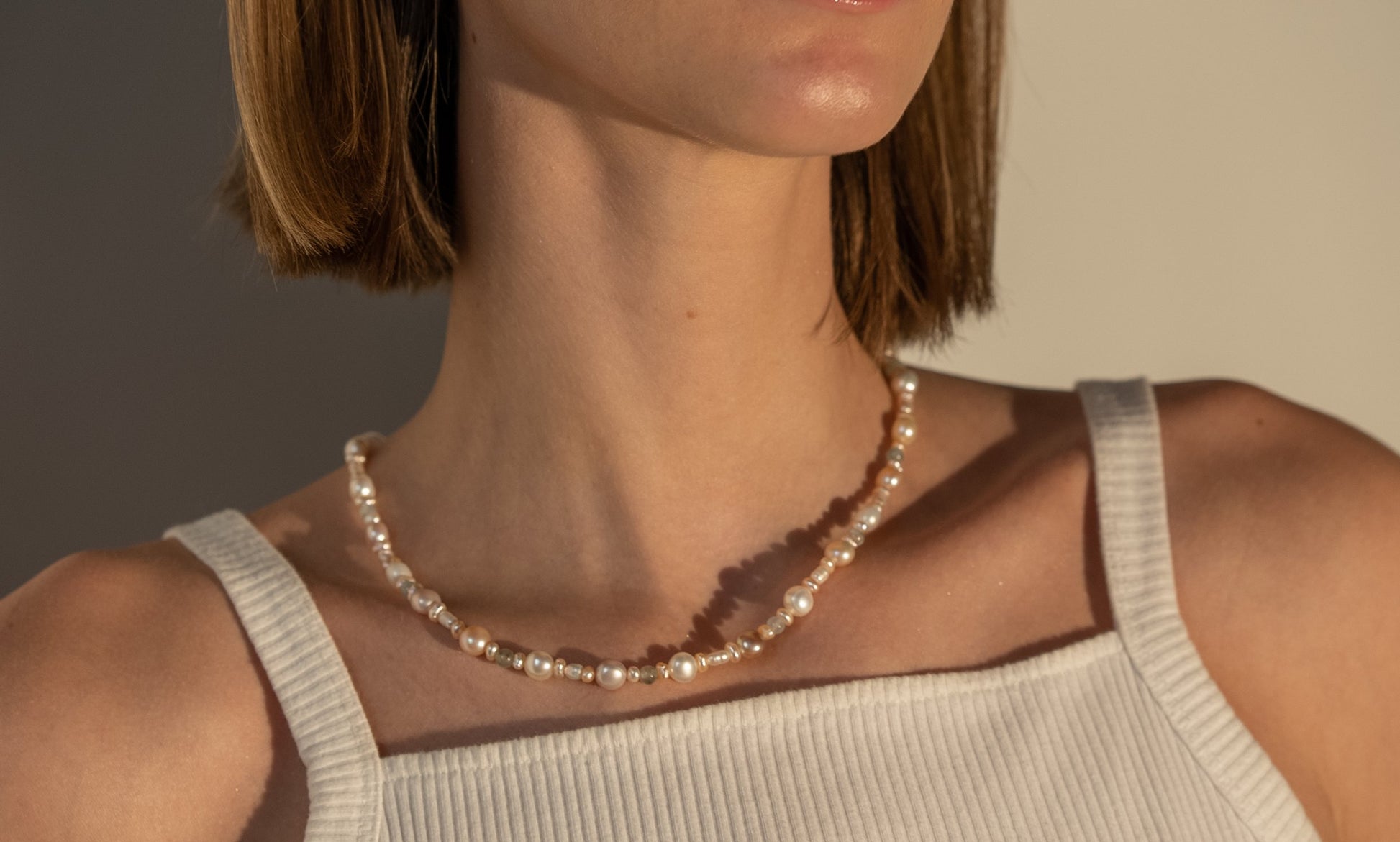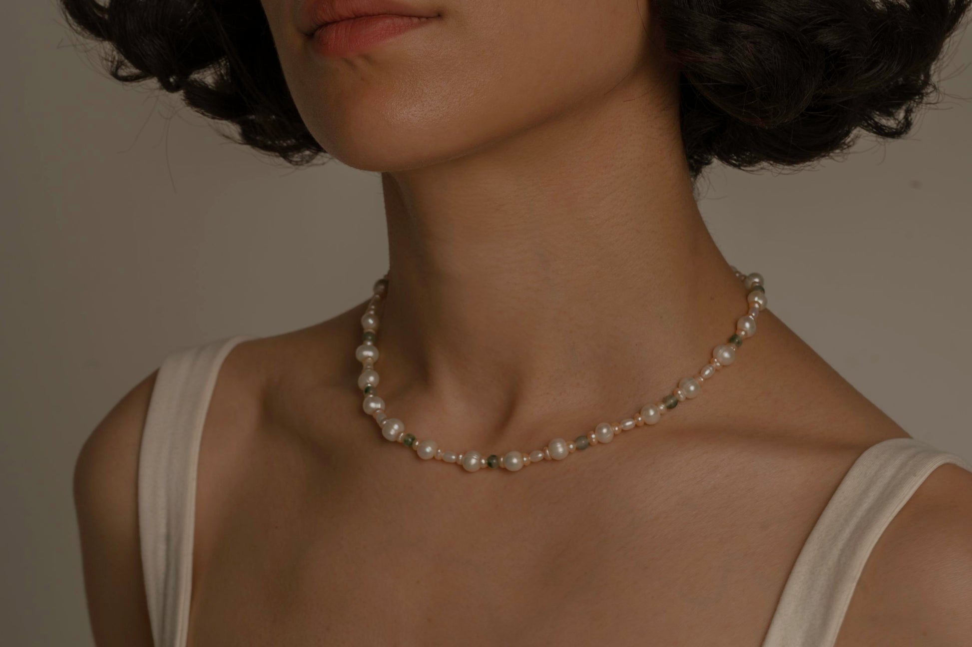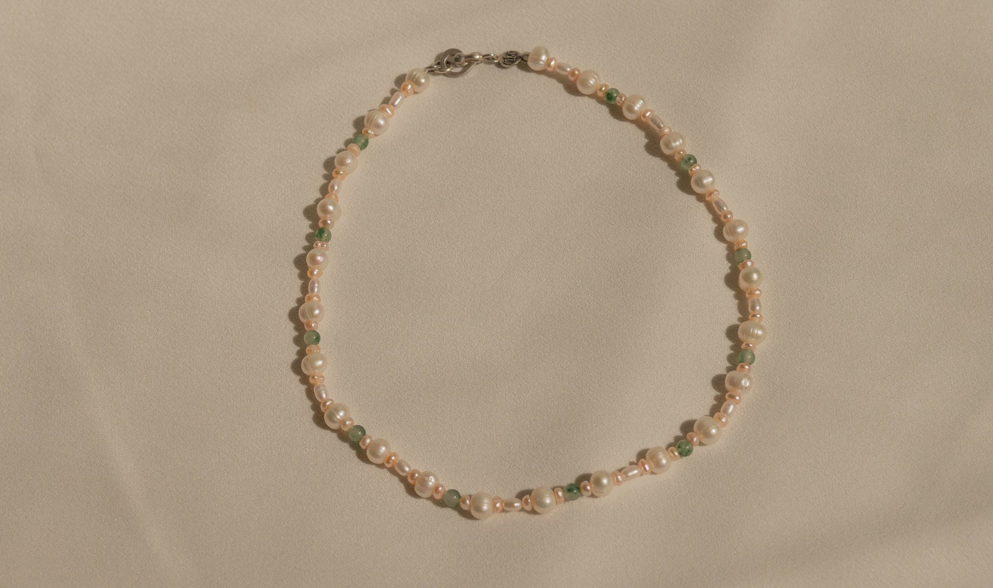 The Mossy Agate Pearl Necklace combines genuine freshwater pearls with earthy moss agate stones, known for their organic tones and grounding energy. Finished with our handmade sterling silver or gold vermeil clasps.