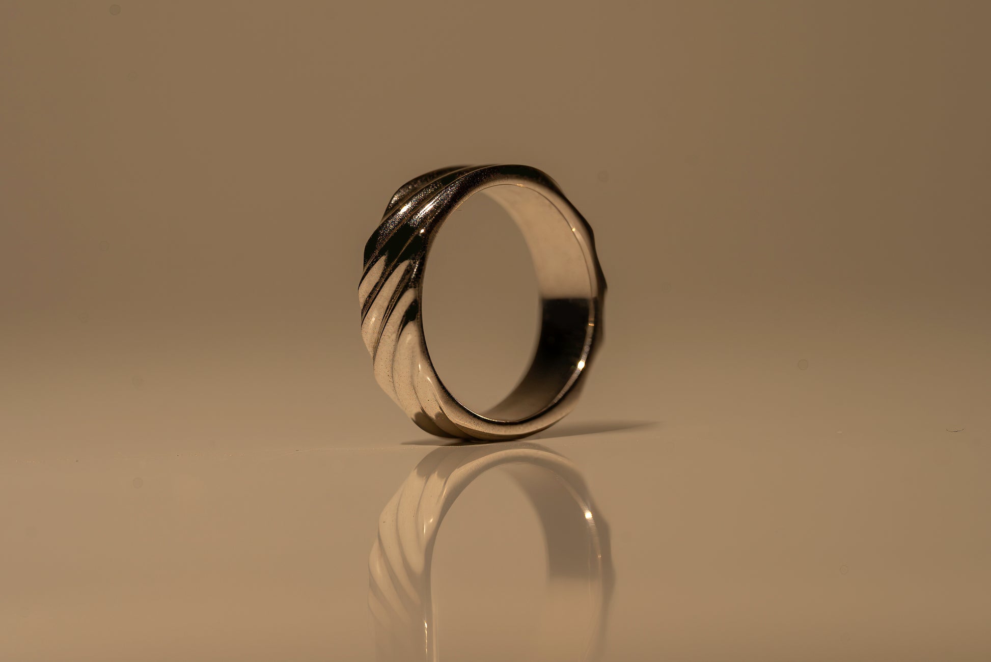 This substantial band captures the energy of continuous motion with a series of deep, diagonal ridges that flow seamlessly around the finger. The sculptural relief is masterfully carved to mimic the undulating surface of water, creating a dynamic play of light and shadow with every turn of the hand. It is a deeply tactile piece ~ rich in weight and visual texture ~ offering a modern, organic interpretation of the classic eternity band. Whether worn as a grounding thumb ring or a statement middle-finger piece, it commands attention with its fluid, architectural presence.