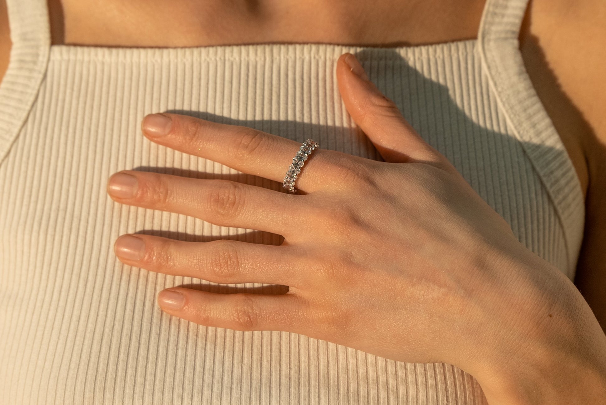 Oval Cut Crystal Ring captures light from every angle with its continuous band of oval-shaped crystals. Its refined silhouette offers the perfect balance of elegance and sparkle, making it an effortless choice for stacking or as a solo statement.