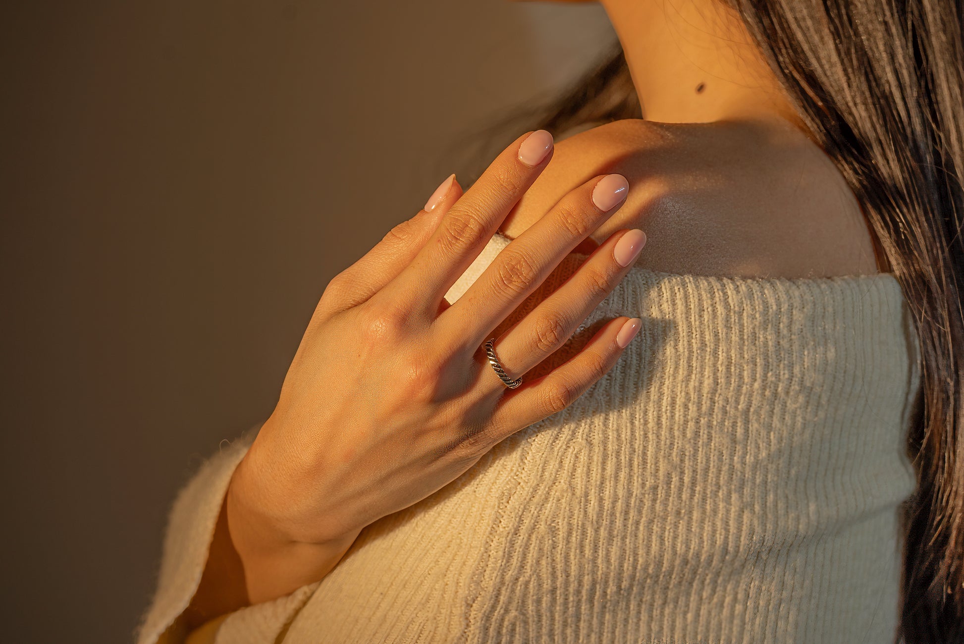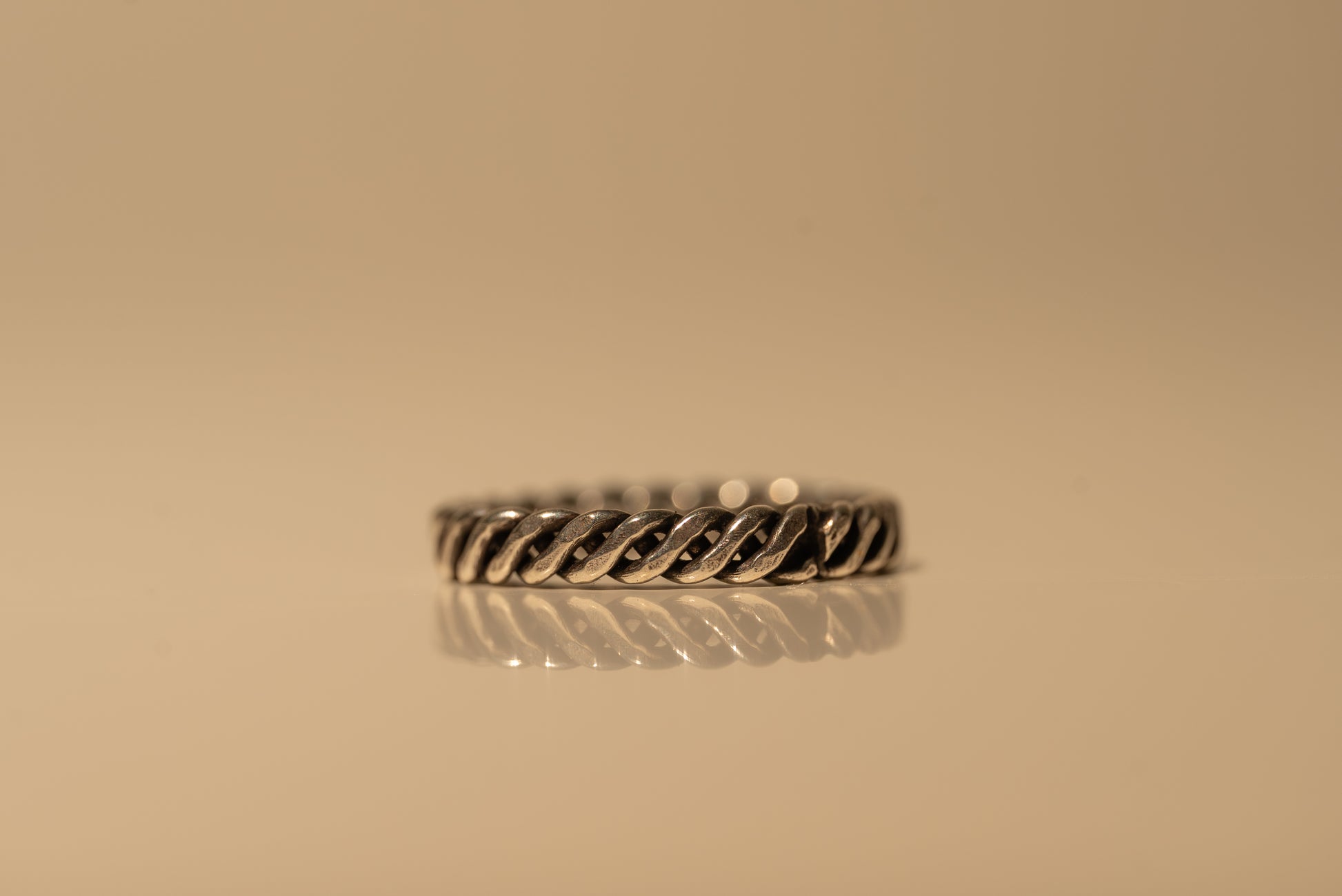 The Ava Band features a continuous, intricately woven motif that draws inspiration from heritage metalwork. To highlight the sculptural depth of the braided silhouette, the silver is intentionally oxidized ~ creating a striking, architectural contrast between the darkened recesses and the highly polished ridges. Rich in tactile detail yet expertly engineered with a perfectly smooth interior, it is an effortless everyday staple designed to add a grounding, vintage-inspired element to your signature ring stack.