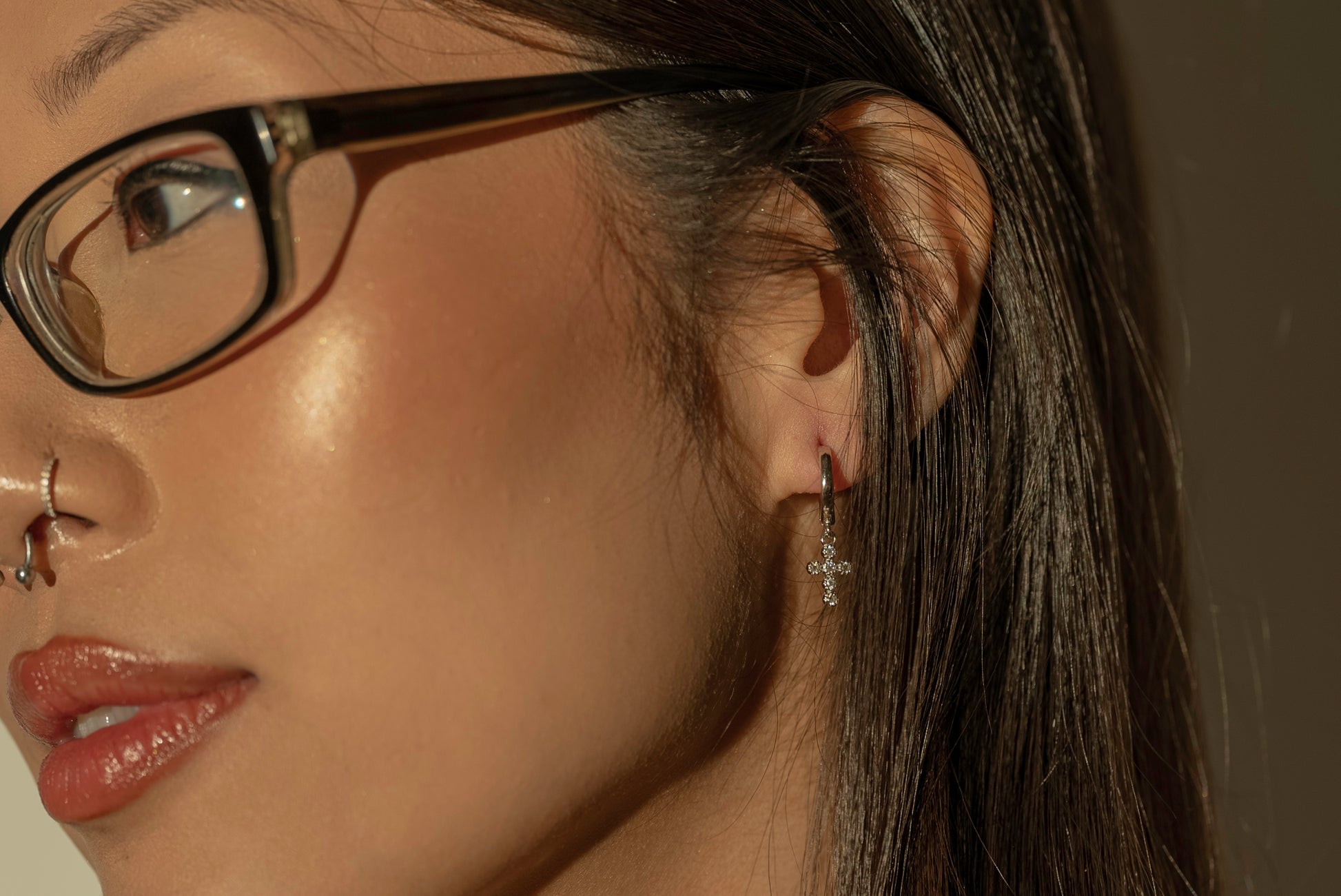 Petite Cross Hoop feature delicate cubic zirconia stones set in a minimalist hoop, creating a refined yet expressive piece perfect for everyday wear.