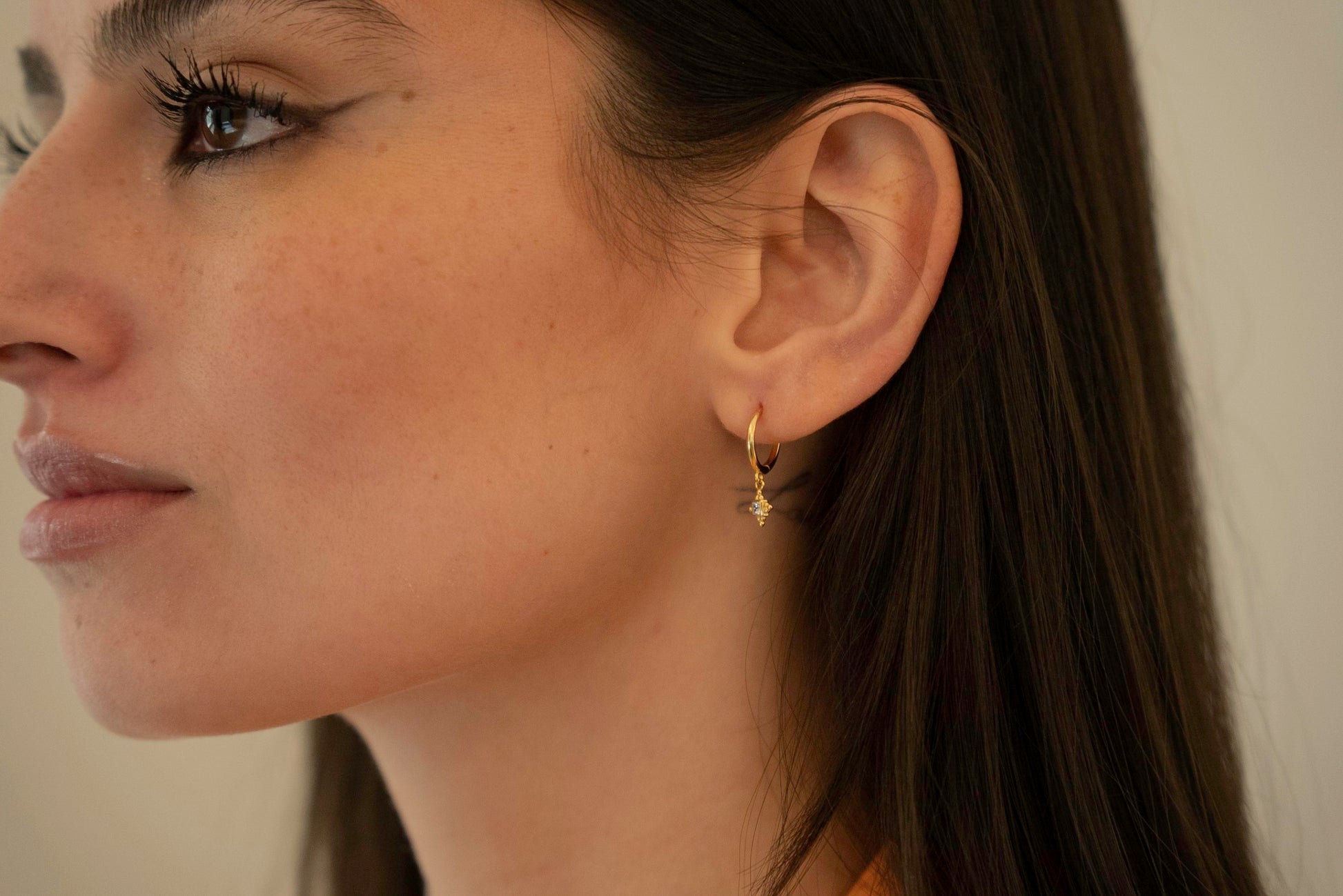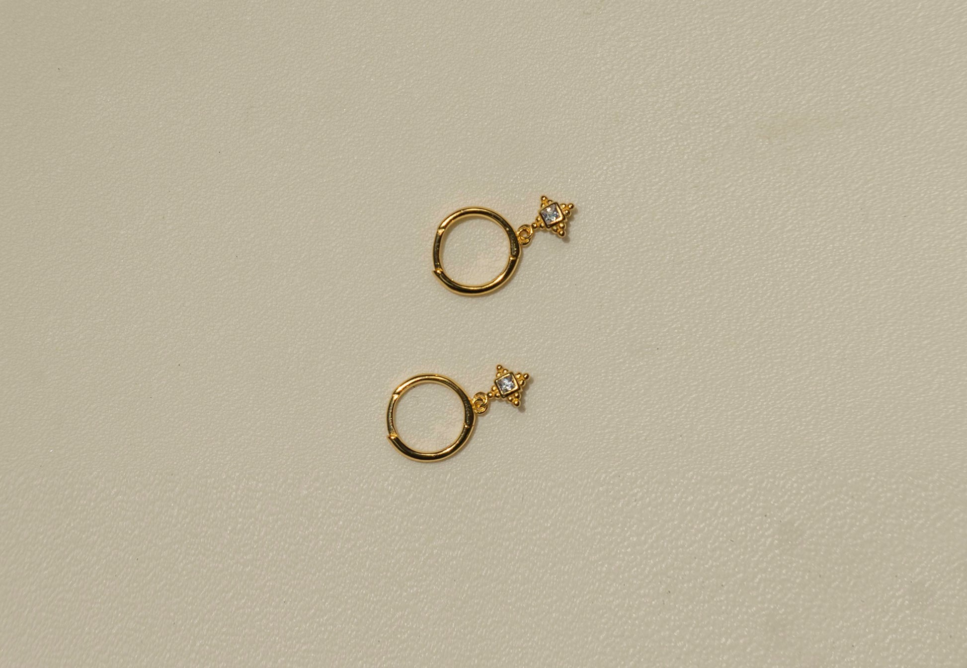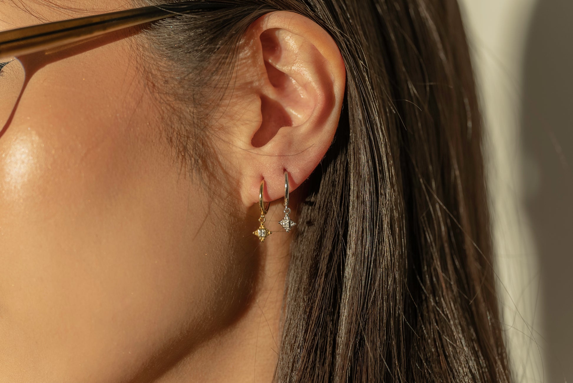 The Petite Diamond Hoops feature a finely crafted hoop with a dangling cubic zirconia charm, radiating subtle sparkle with each movement. Their petite scale makes them perfect for effortless wear~ whether styled as a pair for timeless elegance or as a single for a modern, asymmetric edge.