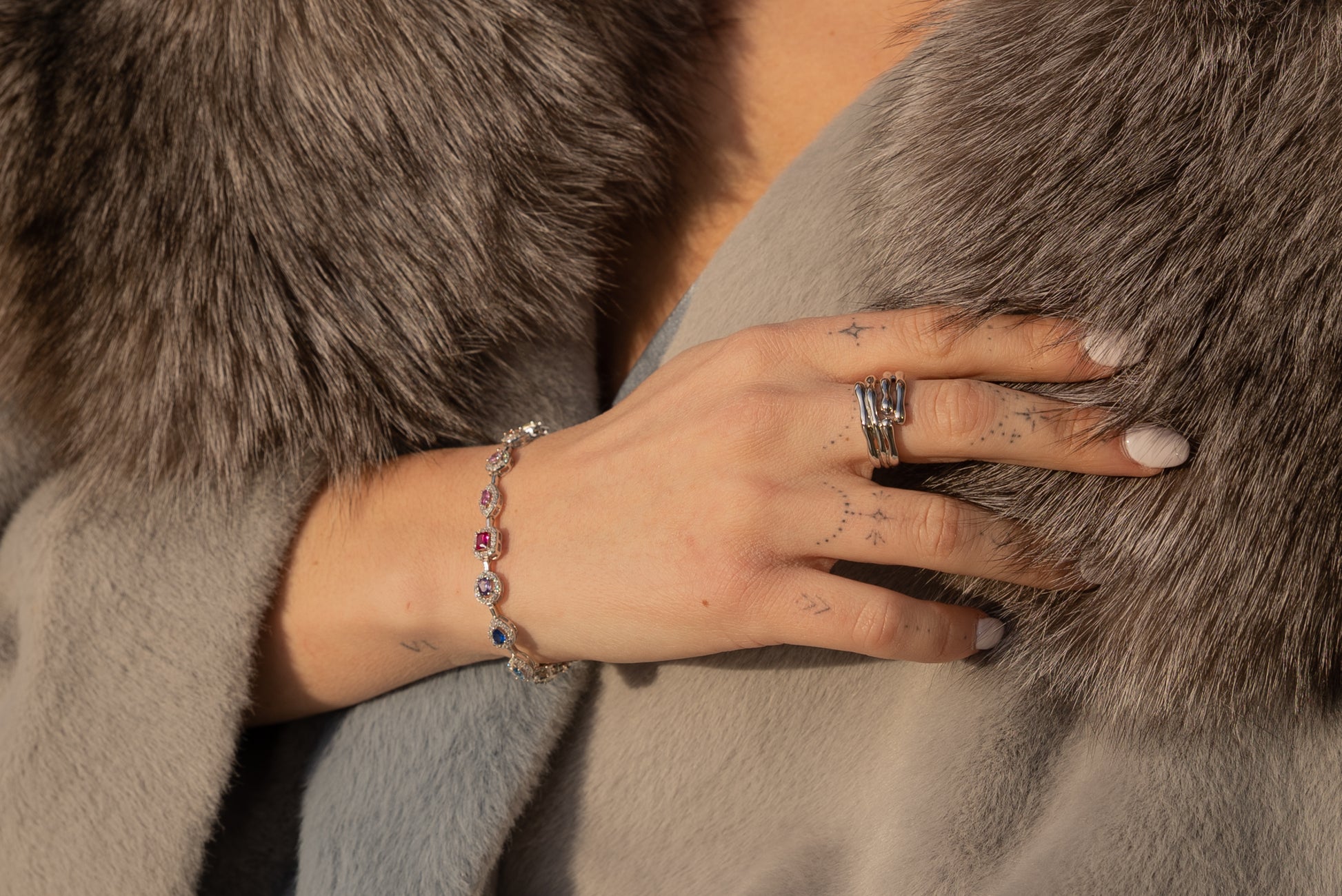 High-quality cubic zirconia and colorful gems in a radiant rainbow palette, precision-set for brilliance.