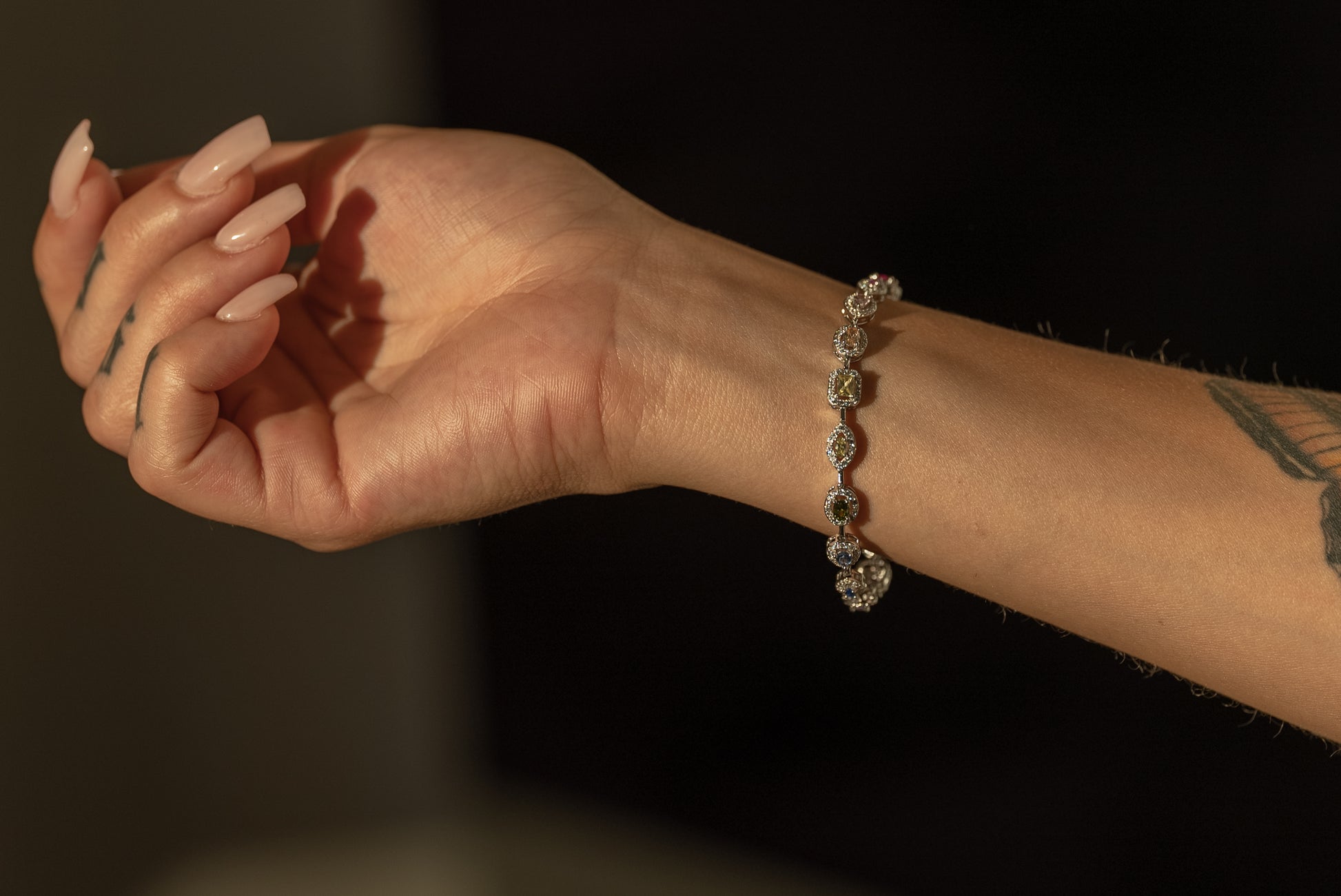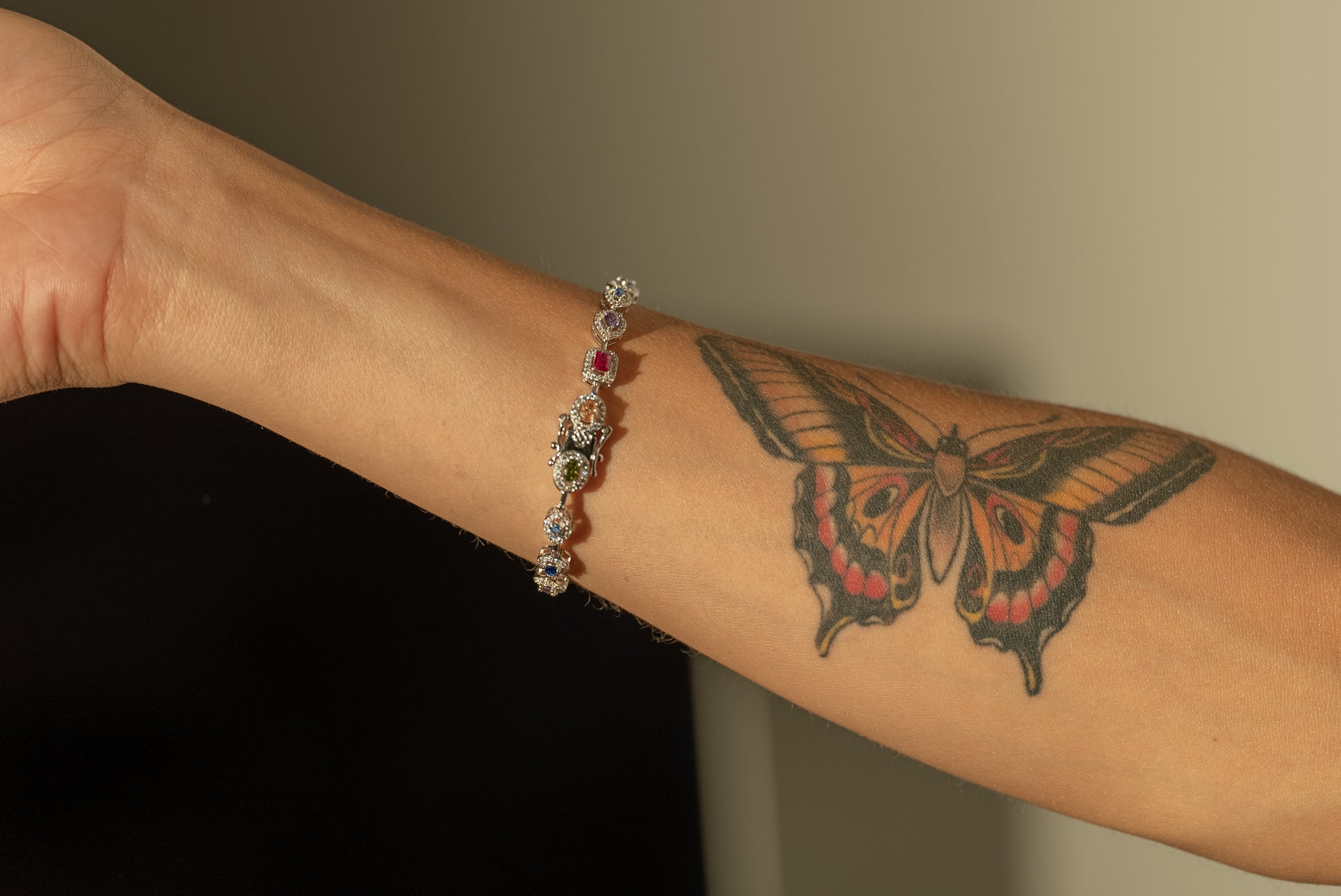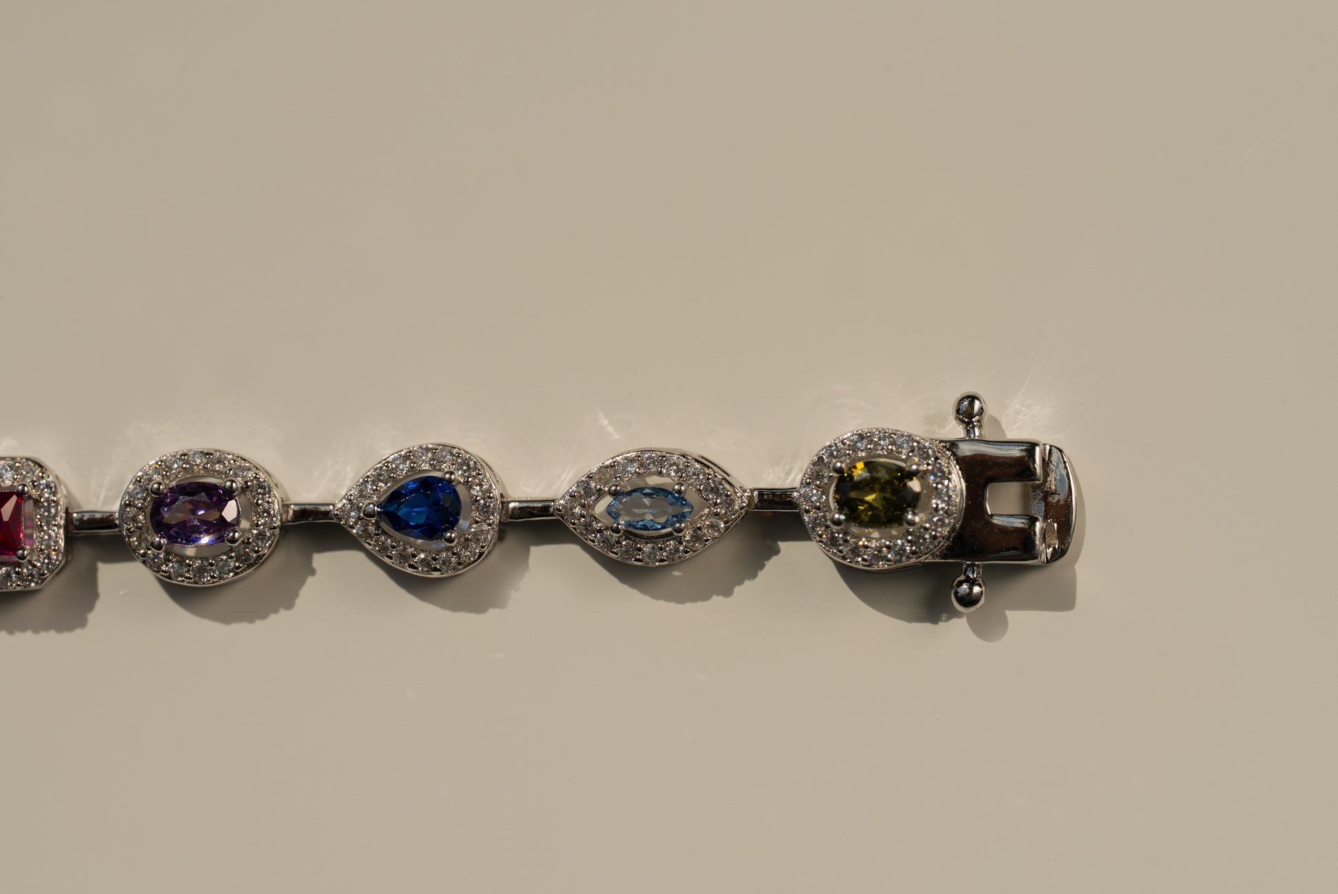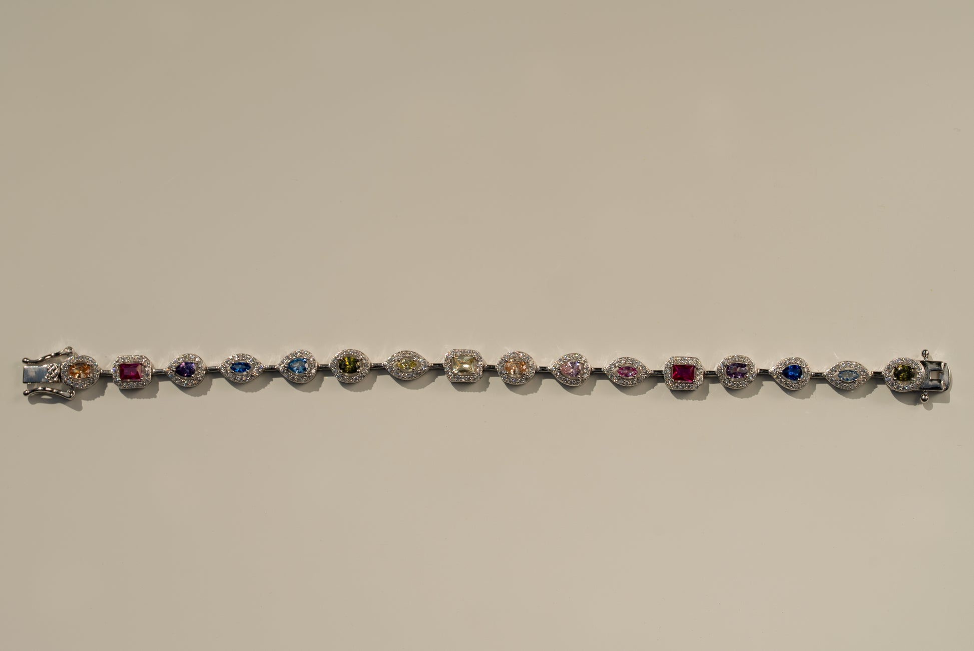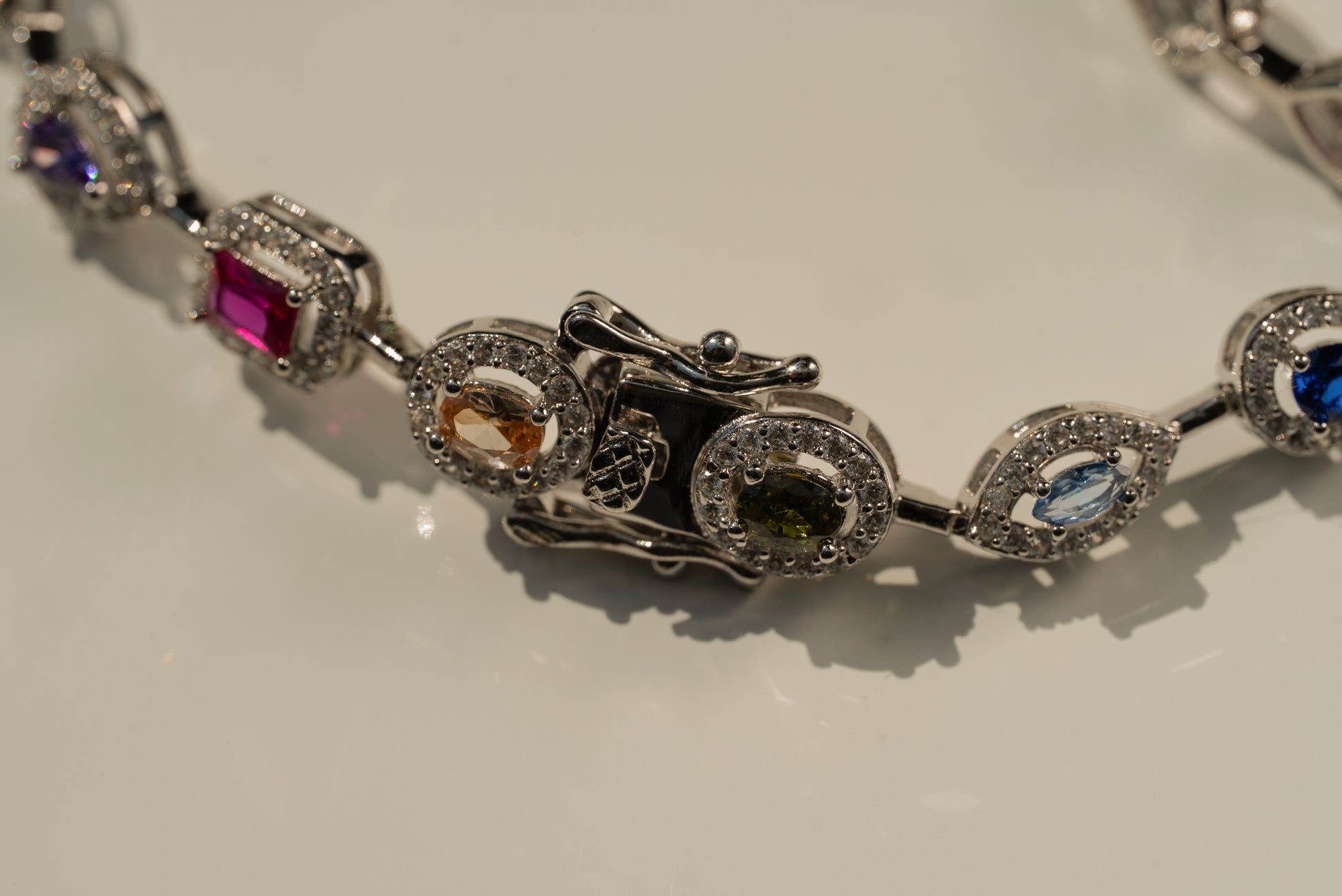 Rainbow Gem Bracelet features a spectrum of vibrant stones, each framed with shimmering detail, secured with a refined clasp for elegance and ease.