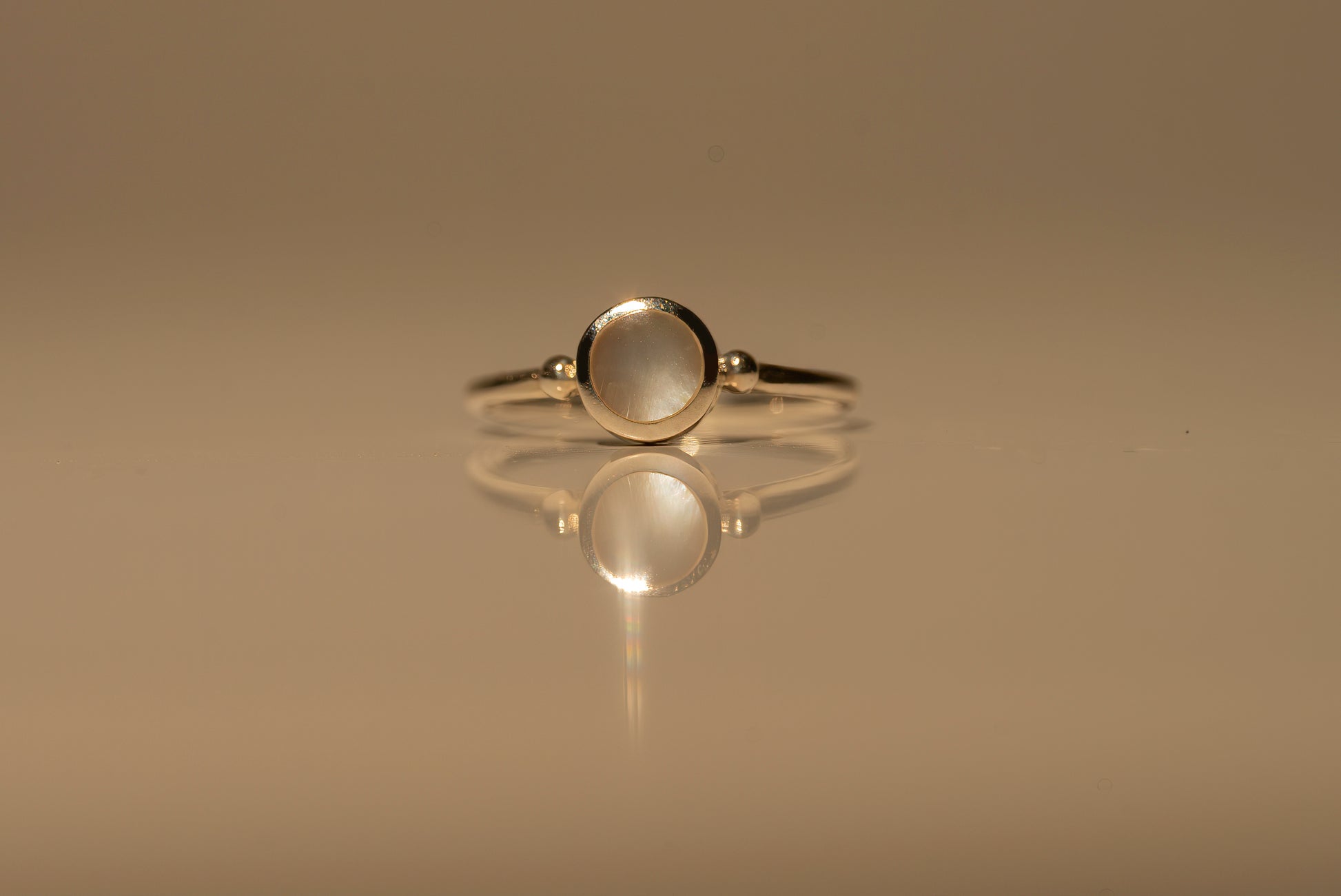 At the heart of this refined band rests a perfectly proportioned disc of natural mother-of-pearl, expertly secured within a seamless bezel setting. This tailored, low-profile technique protects the stone while providing a completely smooth, snag-free surface. Flanked by twin sculptural spheres, the design introduces a subtle, tactile dimension that beautifully frames the pearl’s organic iridescence. Grounded by a whisper-thin, high-polish shank, it is a masterclass in delicate metalwork ~ offering an effortless, luminous touch to your everyday ring stack.