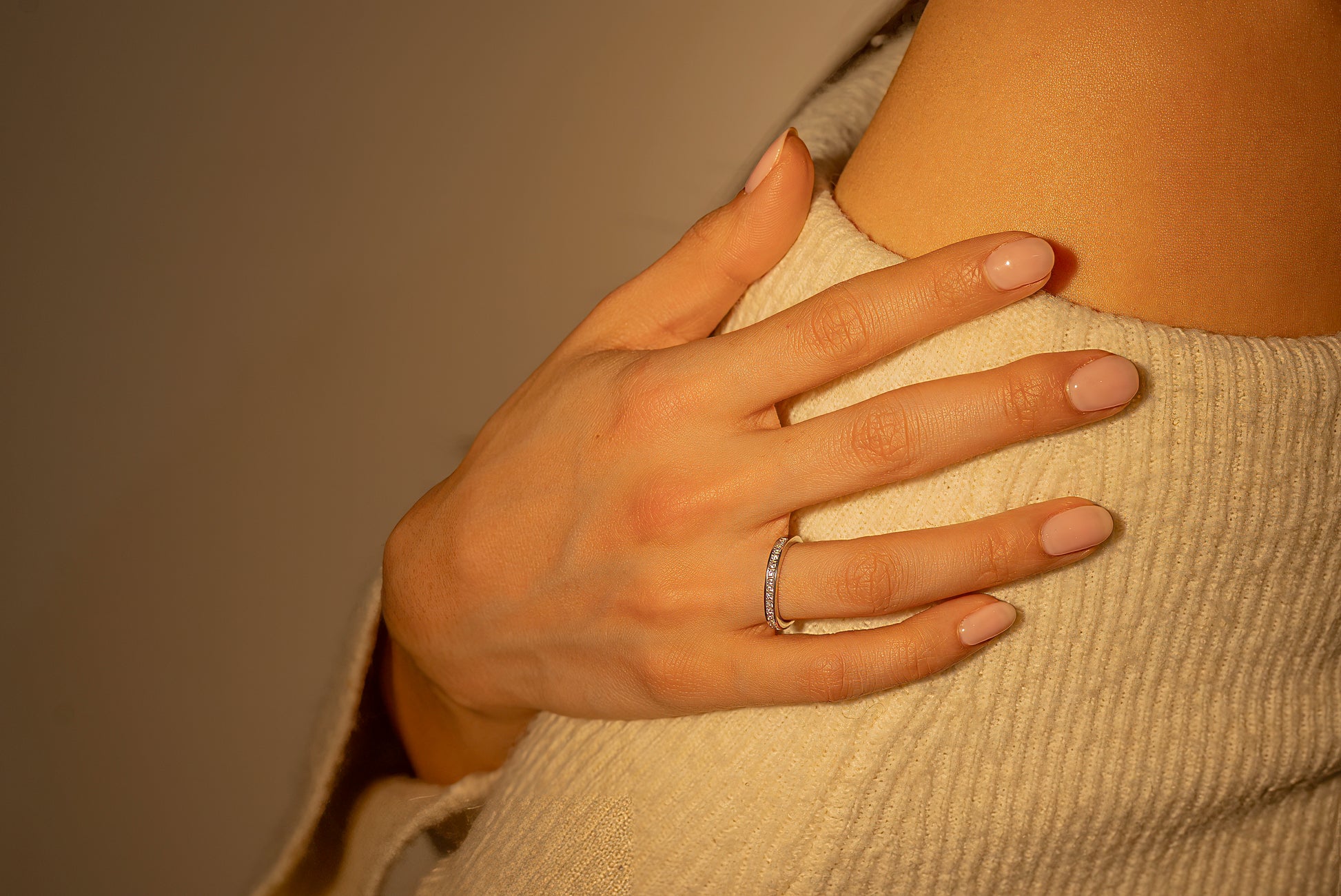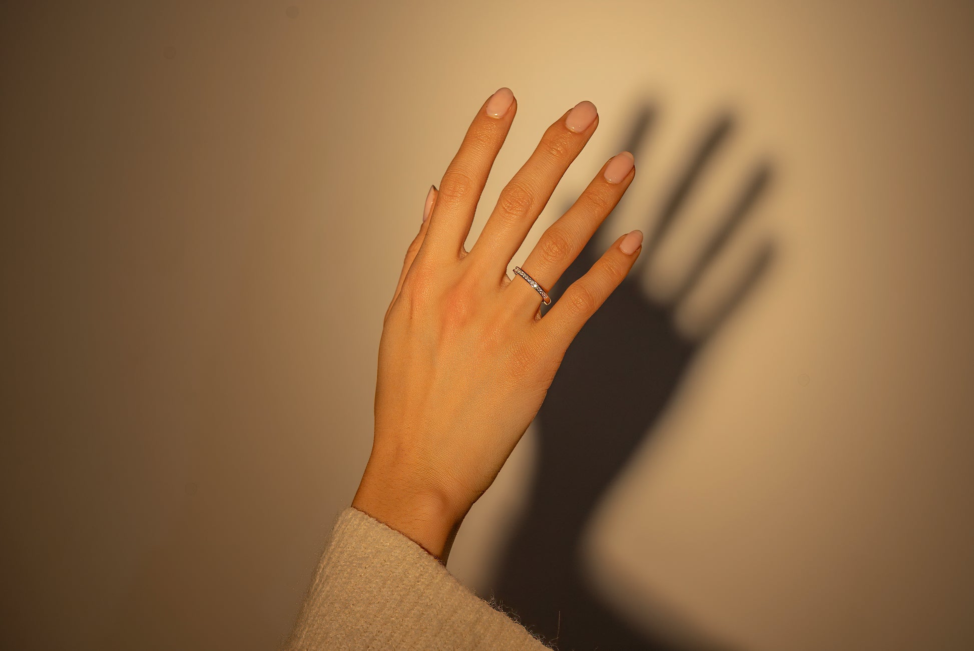 • Proportions: An ultra-thin, low-profile band designed to nest flush against other rings without adding bulk