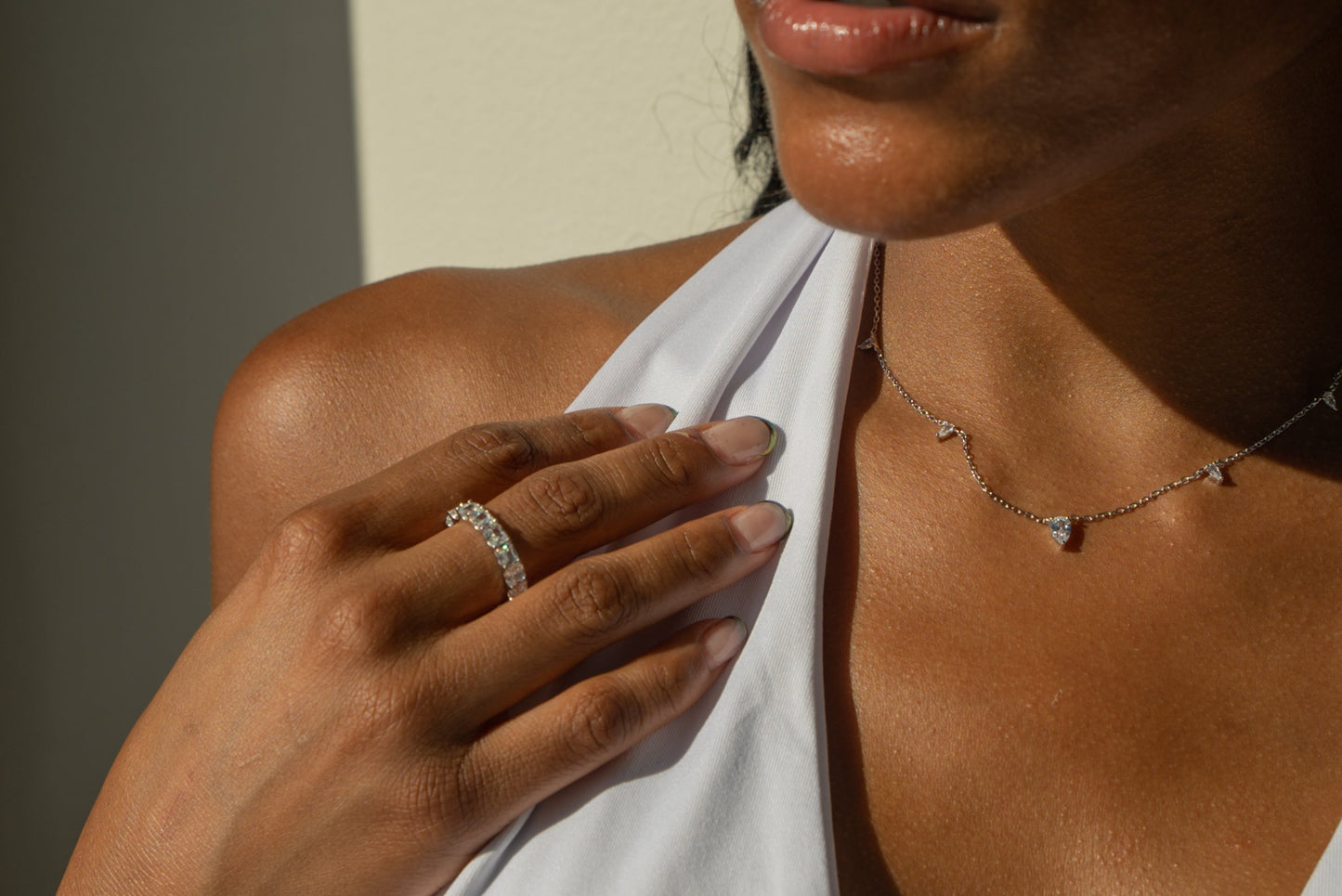 Square Cut Crystal Ring radiates with light-catching brilliance. Featuring an all-around band of precisely cut crystals, it balances timeless elegance with modern glamour. Its structured silhouette makes it perfect as a solo statement or as a dazzling stacker.