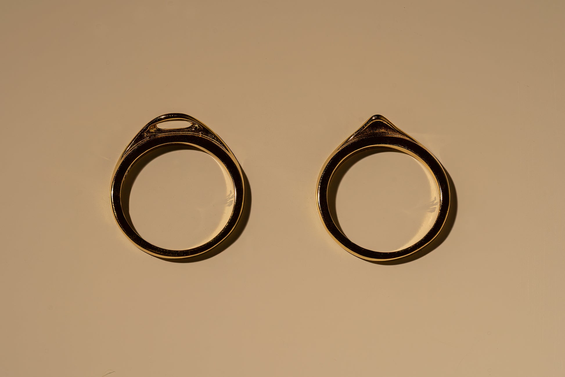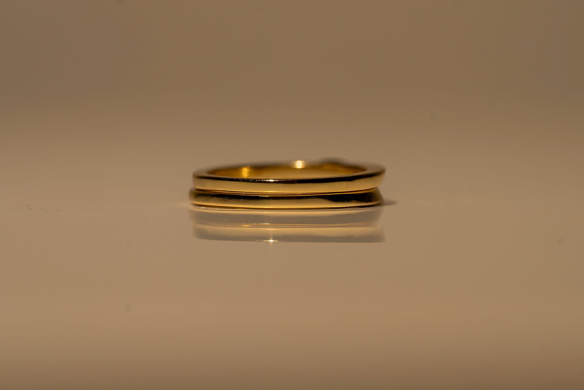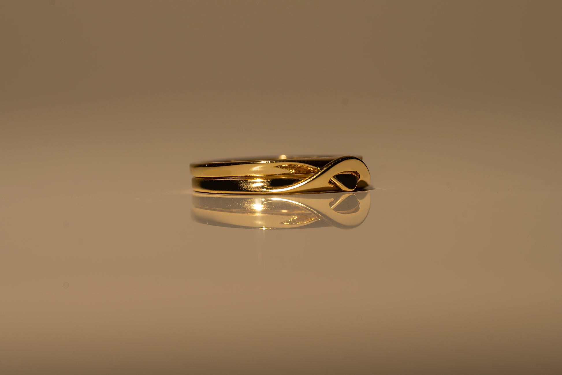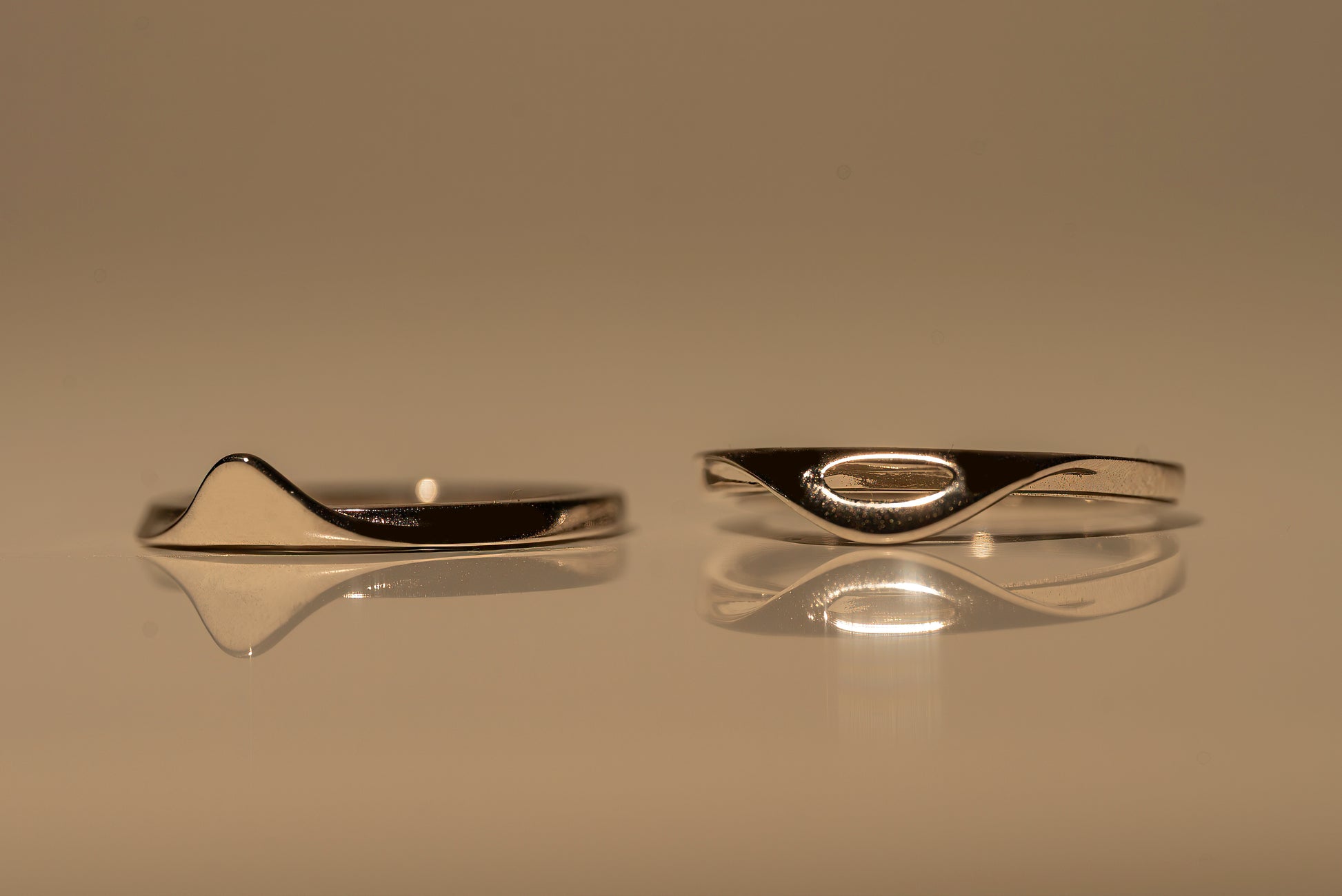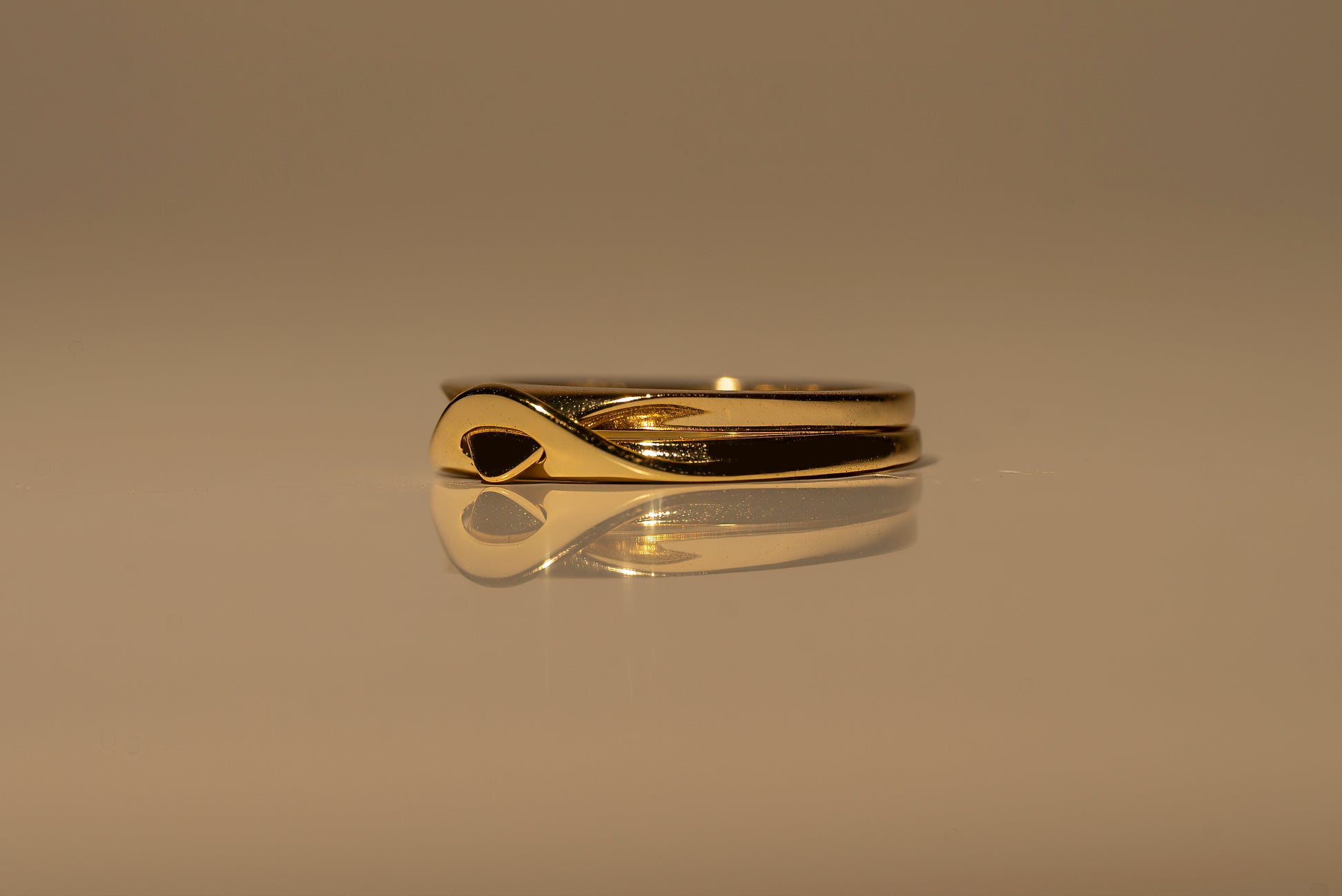 Silhouette: A dynamic "mobile" profile consisting of two high-polish bands that merge to create a singular, unified statement on the finger.