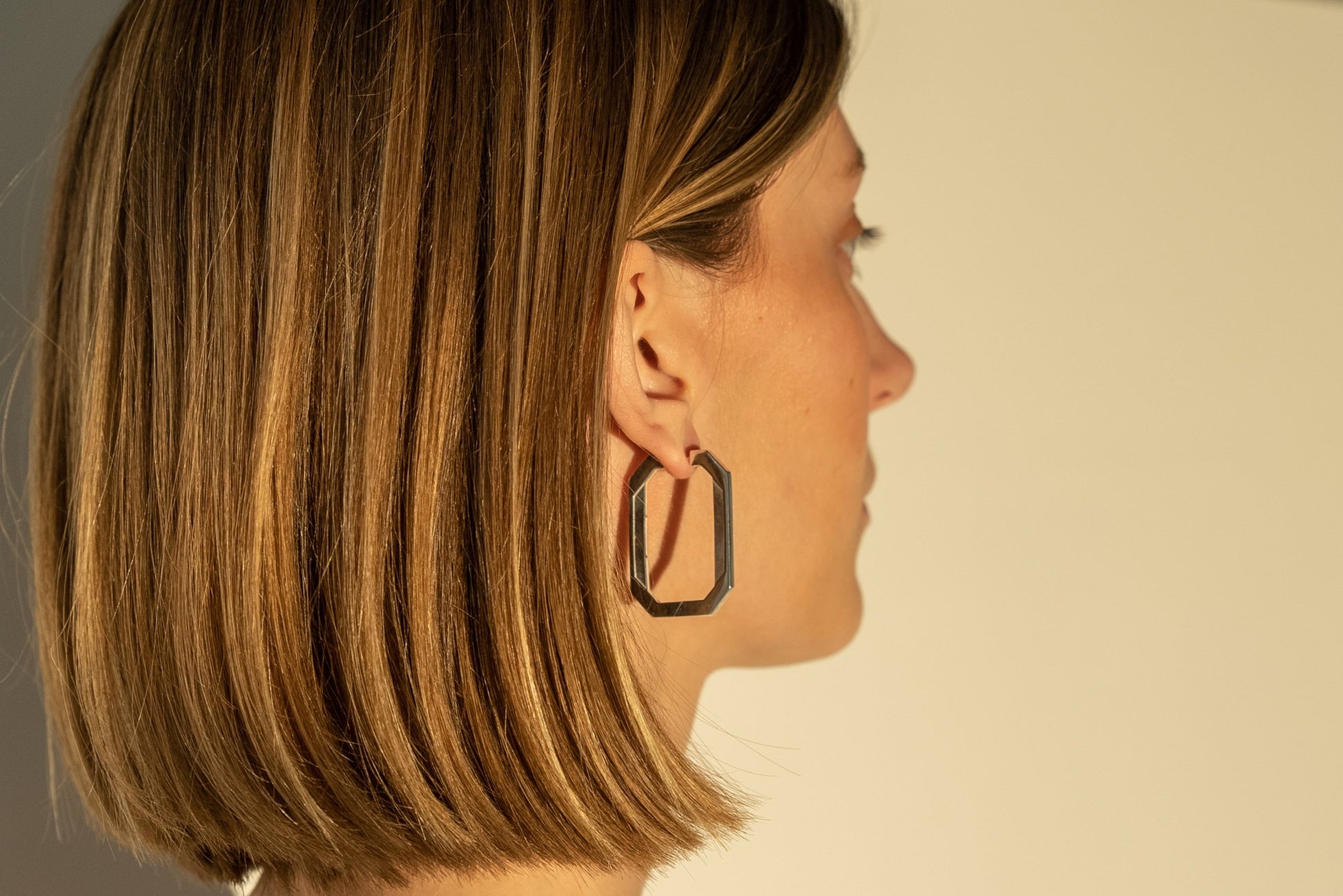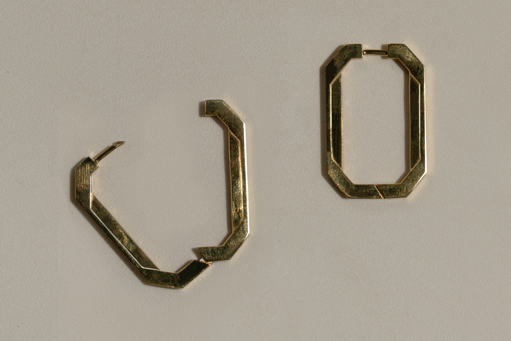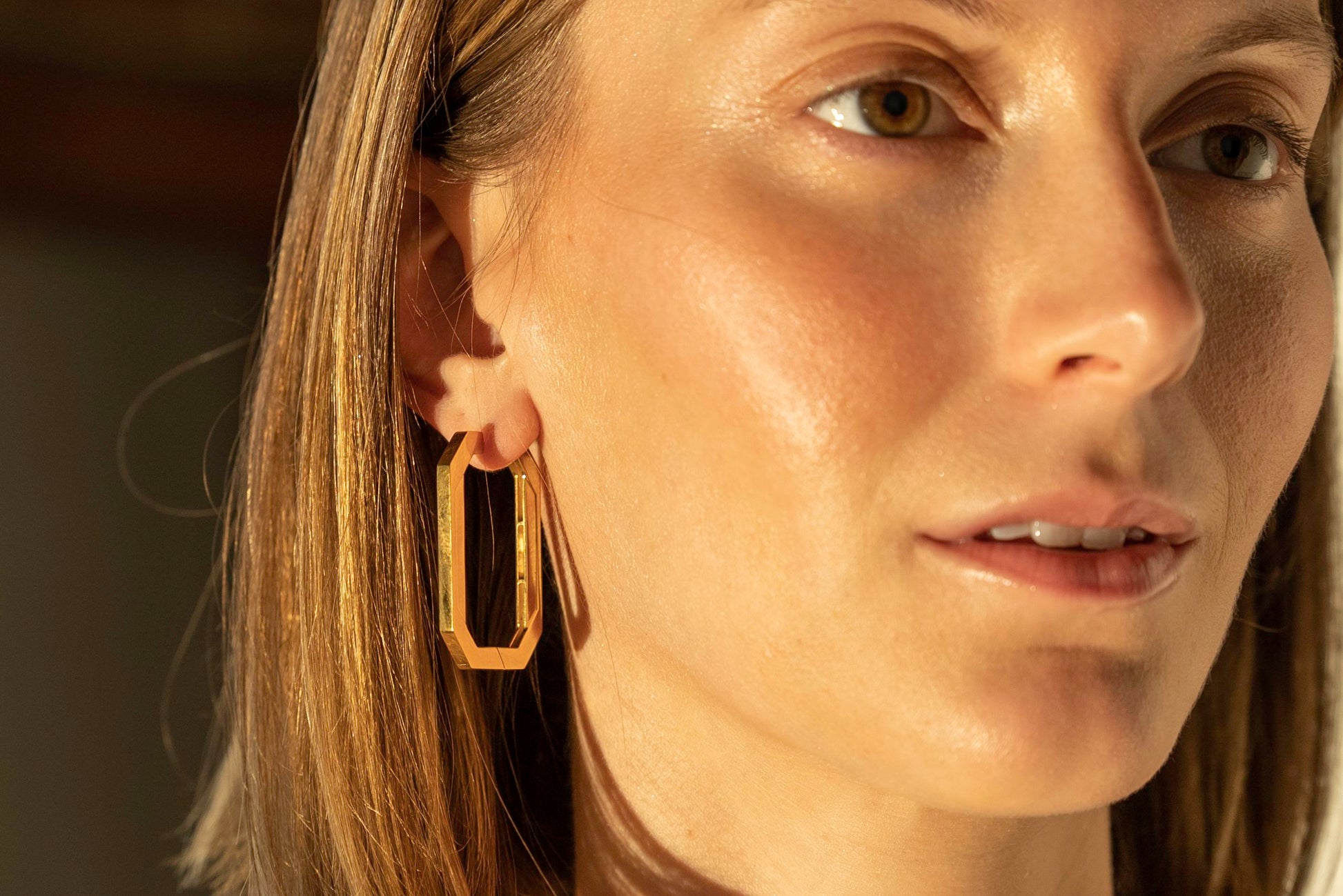 A bold evolution of the classic Geo Hoops, the Tall Geo Hoops feature elongated geometric links that bring striking dimension to any look. Handmade with clean edges and a polished finish, these sculptural earrings balance modern architecture with everyday wearability. Lightweight yet impactful, they’re designed to stand out on their own or complement the rest of the Geo collection.